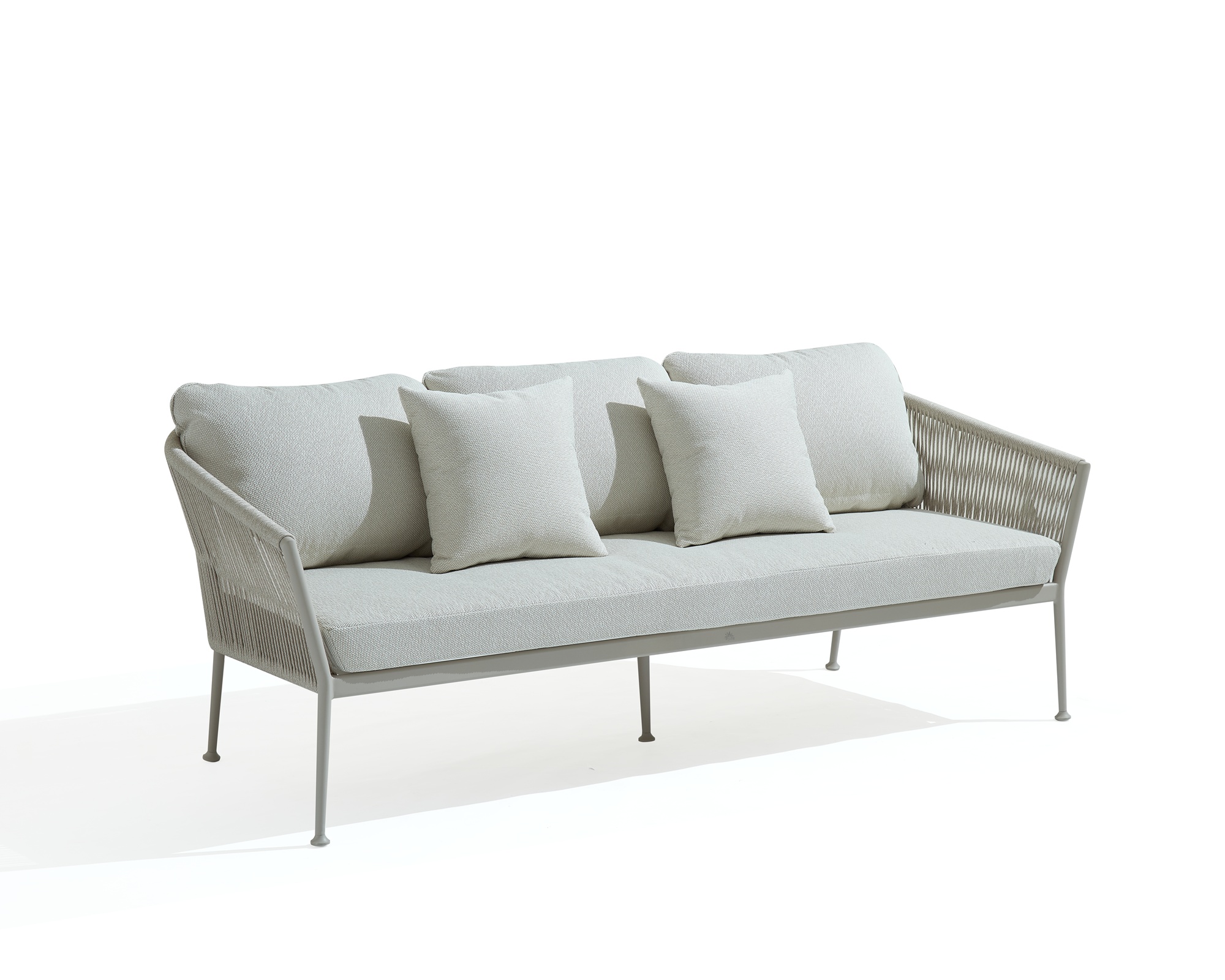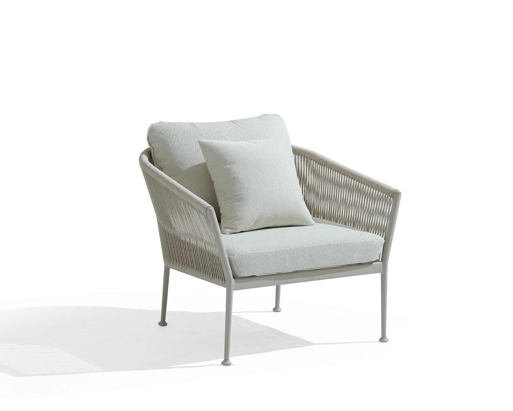 Das leichte und stabile Aluminium-Gestell ist rostfrei und ideal für den dauerhaften Einsatz im Aussenbereich geeignet. Die Rückenlehnen sind hochwertig geschnürt und verleihen dem Set eine moderne, luftige Optik. Die Farbgebung in Light Grey wirkt zeitlos, elegant und lässt sich vielseitig kombinieren.