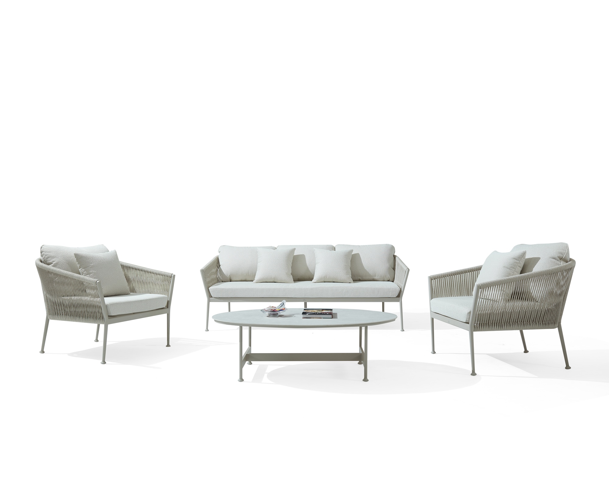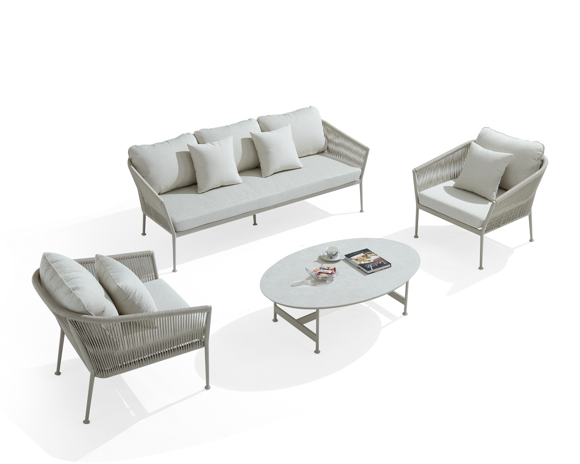 - Lounge mit Rope und Kissen in Beige,Gestell Aluminium pulverbeschichte Champagner, Tischplatte Keramik Travertin