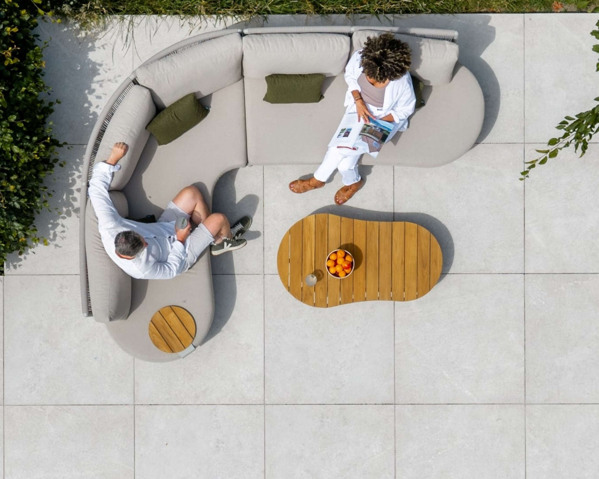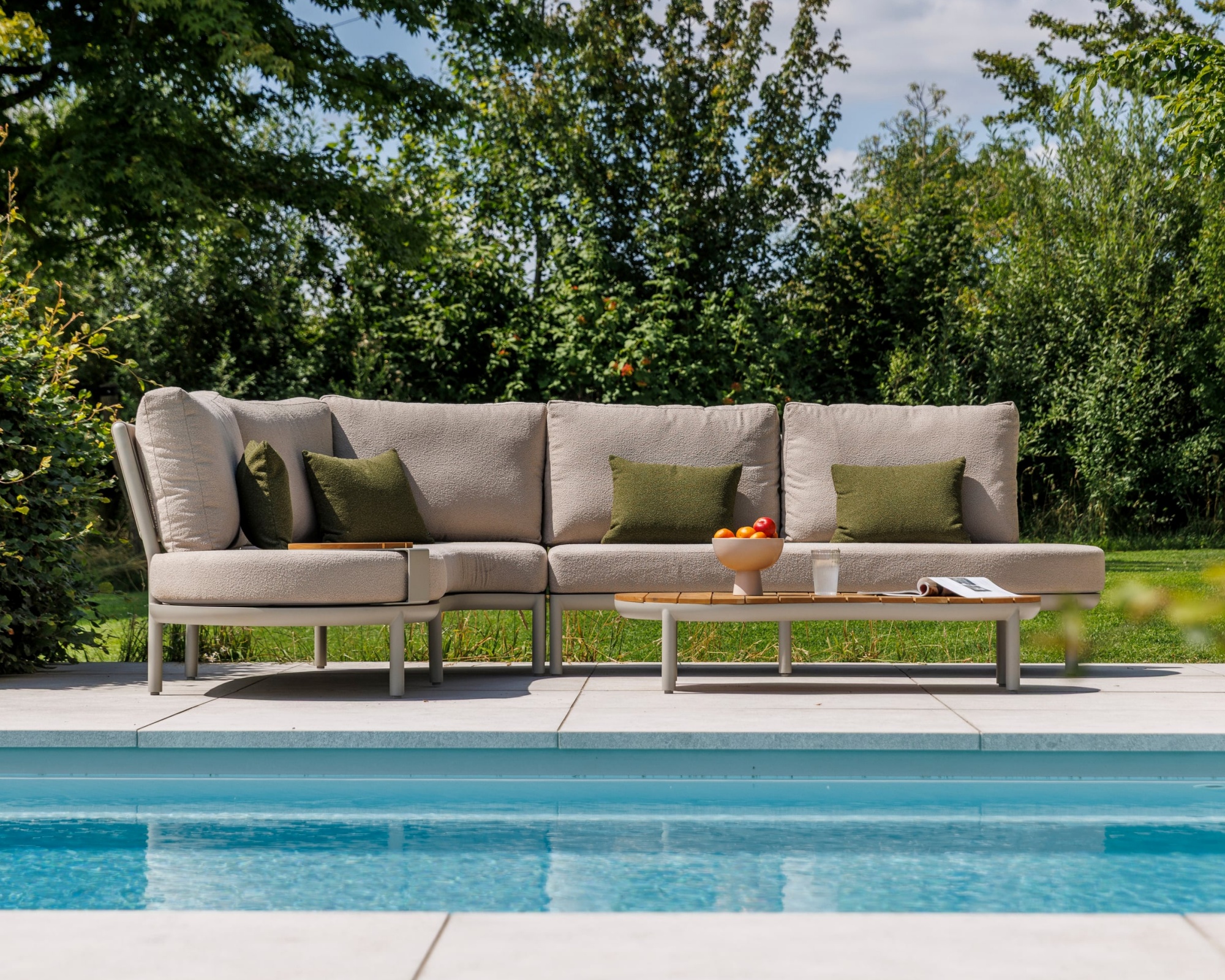 Die Olympus Lounge besticht durch ihr organisches Design mit sanft abgerundeten Profilen und formschönen Kissen, die die natürlichen Linien des Gestells harmonisch aufnehmen. Die elegante Rückenlehne mit RuCore+ Seil setzt ein stilvolles Highlight und überzeugt zugleich durch ihre Pflegeleichtigkeit.