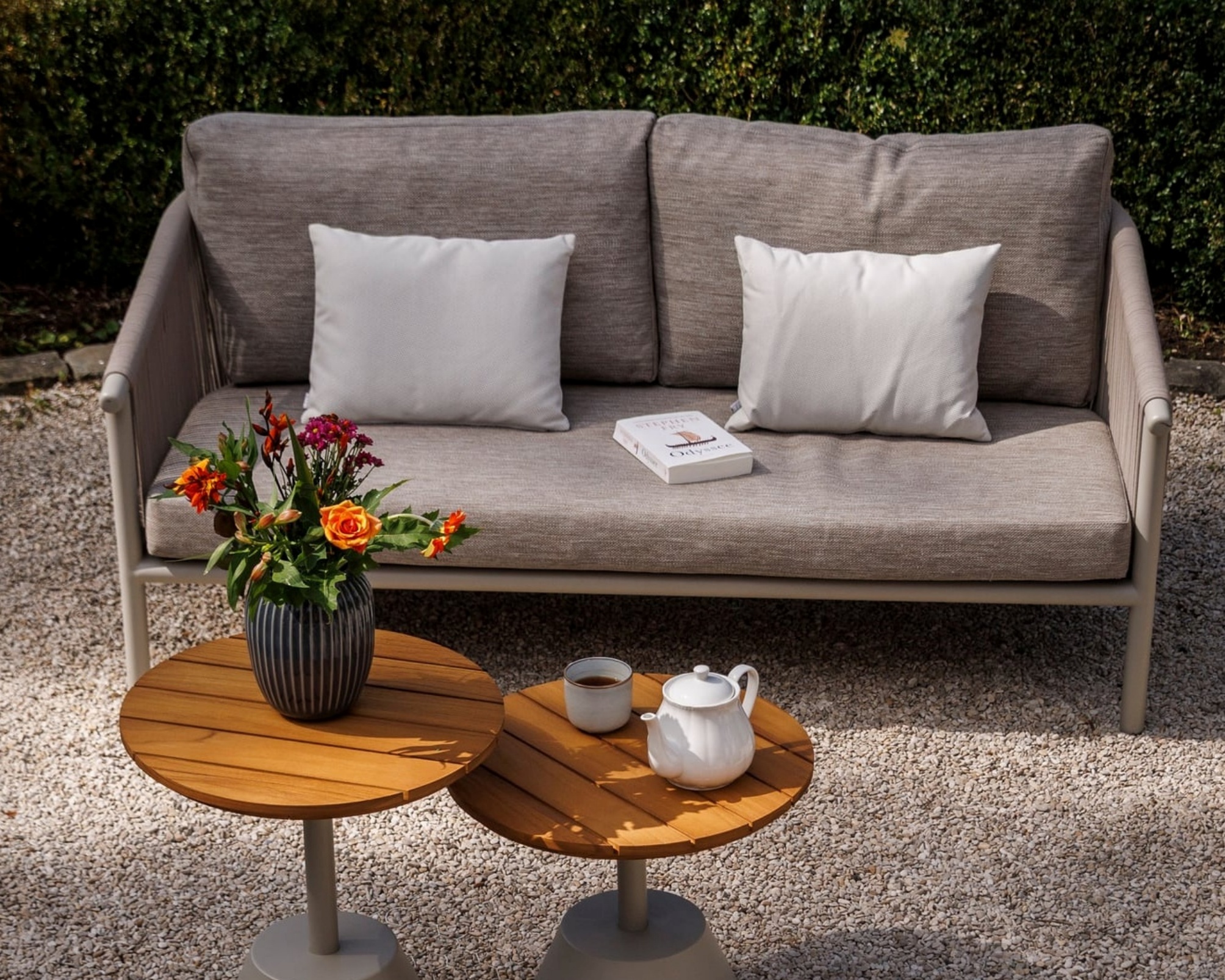 Das Gartenlounge 2er Sofa Moma in Beige überzeugt mit einem modernen Design und einer raffinierten vertikalen Schnürung, die ihr einen zeitgenössischen Charakter verleiht. Das organisch geformte Gestell mit abgerundeten Rohren und sichtbar geführten Hinterbeinen wirkt einladend und zugleich elegant.