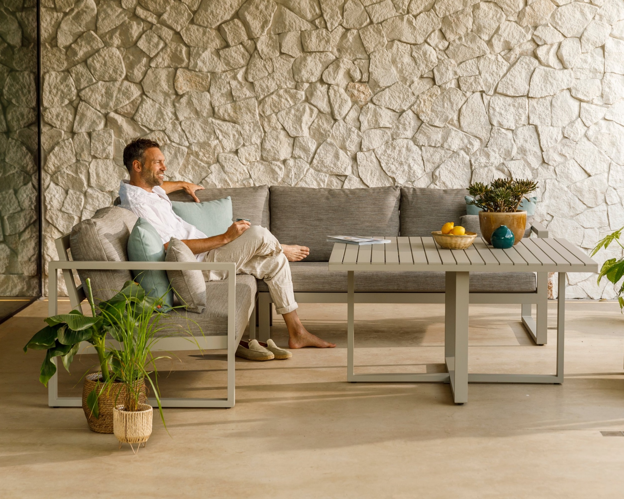 Gefertigt aus robustem Aluminium in Taupe, ist das Set witterungsbeständig und besonders pflegeleicht. Der stabile Rahmen in Kombination mit den wetterfesten Bouclé-Kissen bietet eine ausgewogene Balance aus Komfort und Stützkraft – ideal zum entspannten Verweilen, Loungen oder gemütlichen Essen im Freien.