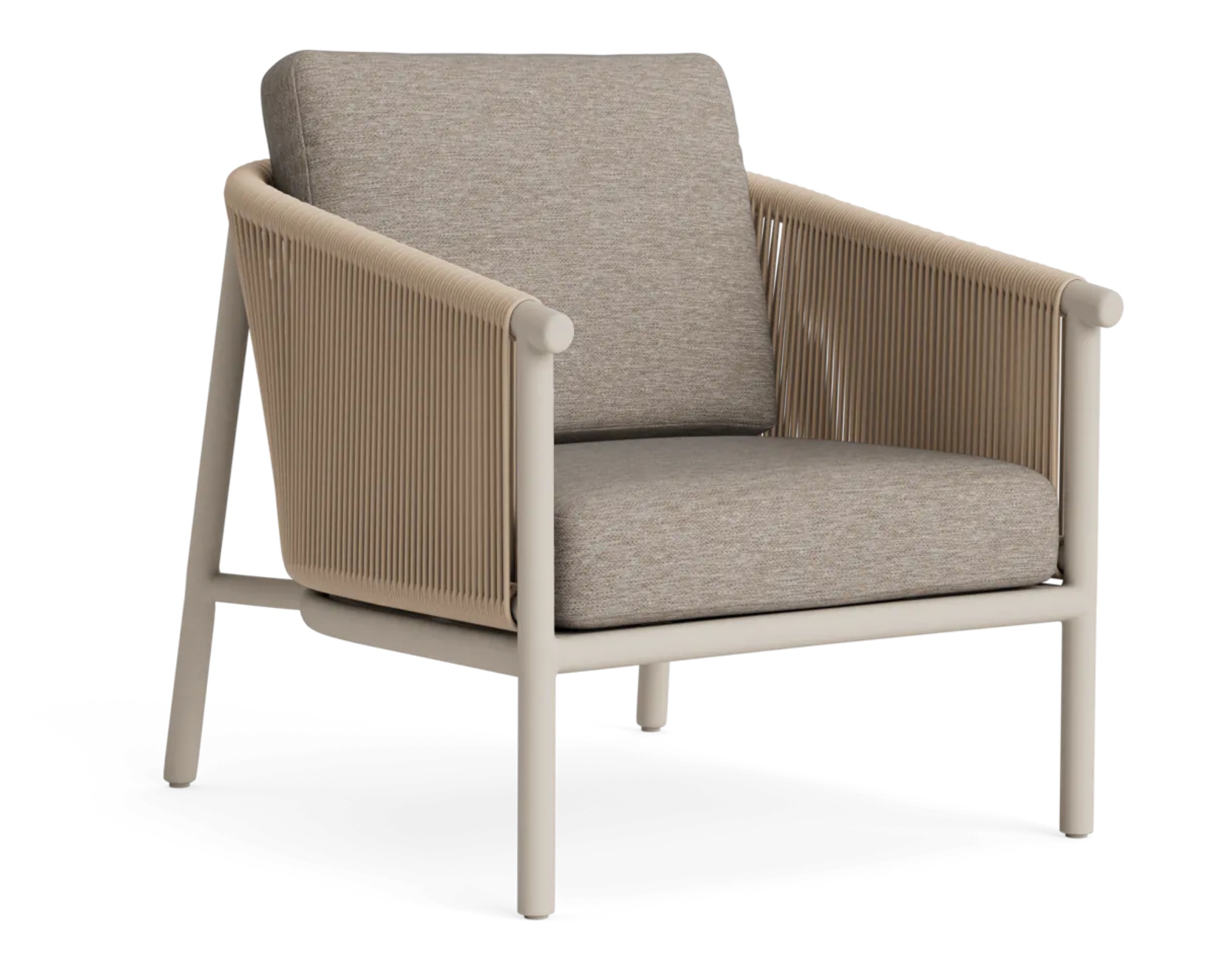 Der Textilene-Sitz, ergänzt durch grosszügige Kissen, sorgt für langanhaltenden Komfort und optimale Unterstützung. Eine moderne Lounge, deren organische Details sich nahtlos in zeitgenössische Aussenbereiche einfüget.