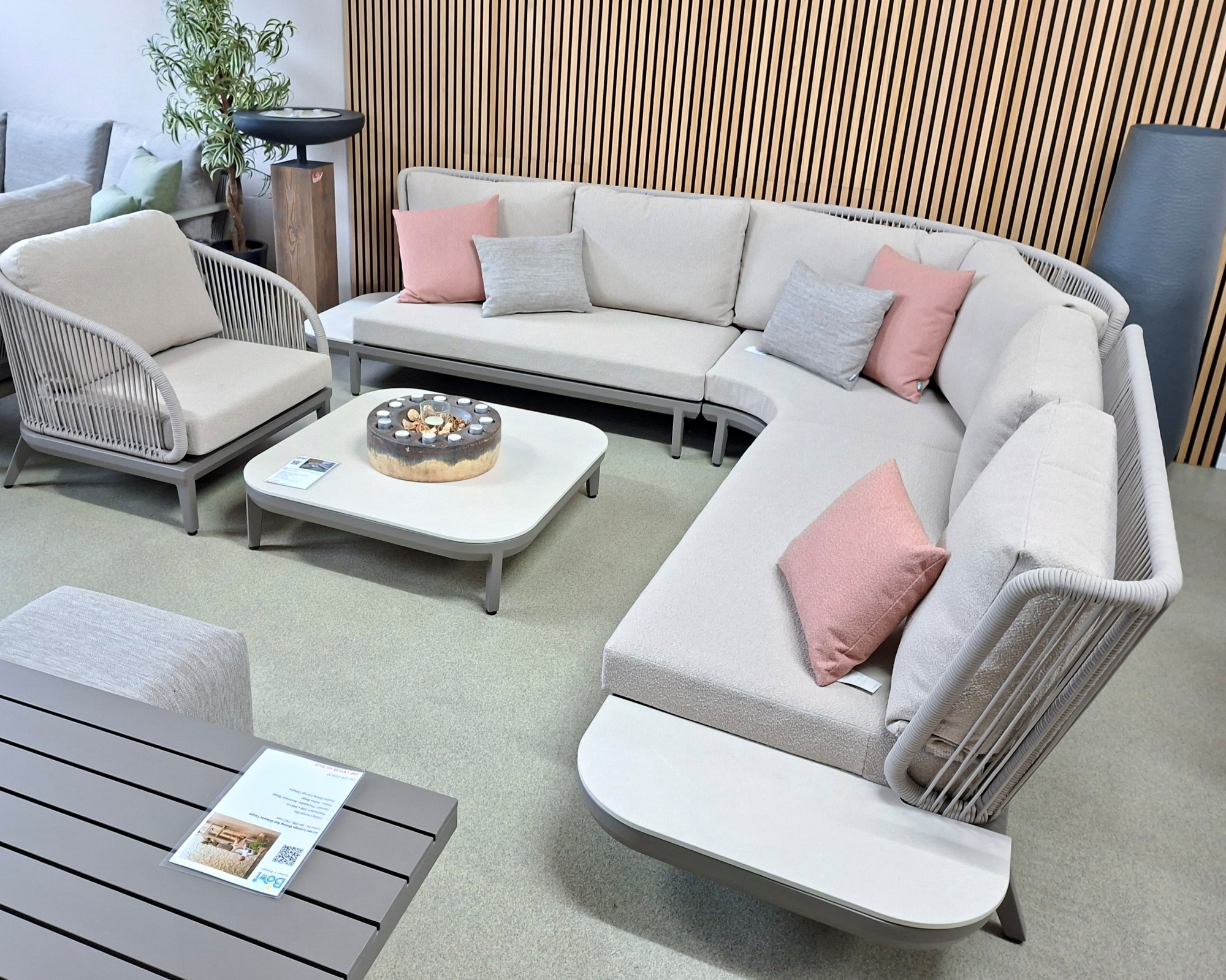 - Lounge Alpes Gestell Aluminium Taupe, Rope Beach, Kissen Boucle Sand, Tischplatte Keramik Ivory