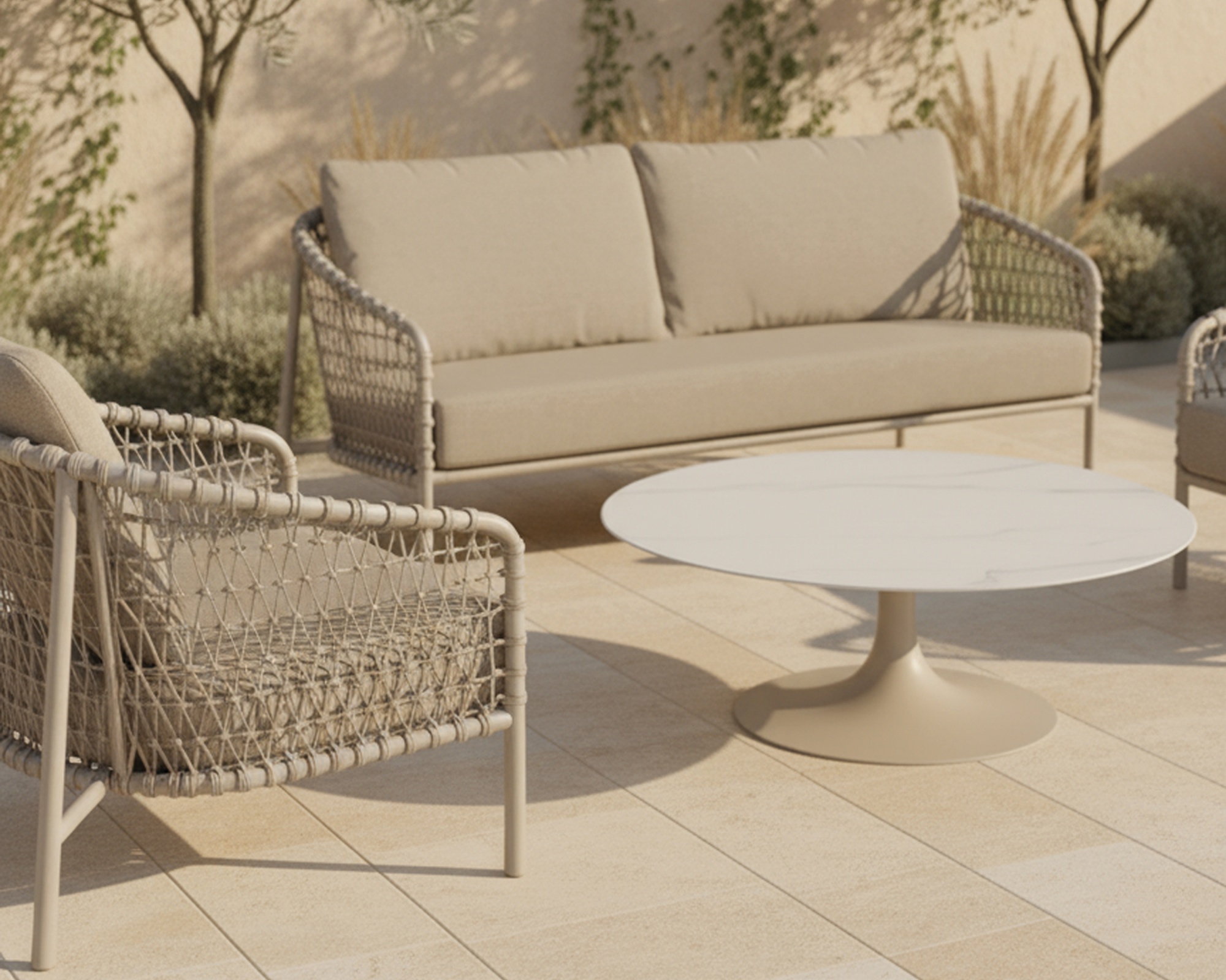 Das Como Lounge Set überzeugt mit weichen, organischen Formen und einem eleganten Geflecht in dezenten Beigetönen. Die All-weather-Soltex-Kissen sorgen für hohen Sitzkomfort und eine einladende Atmosphäre.