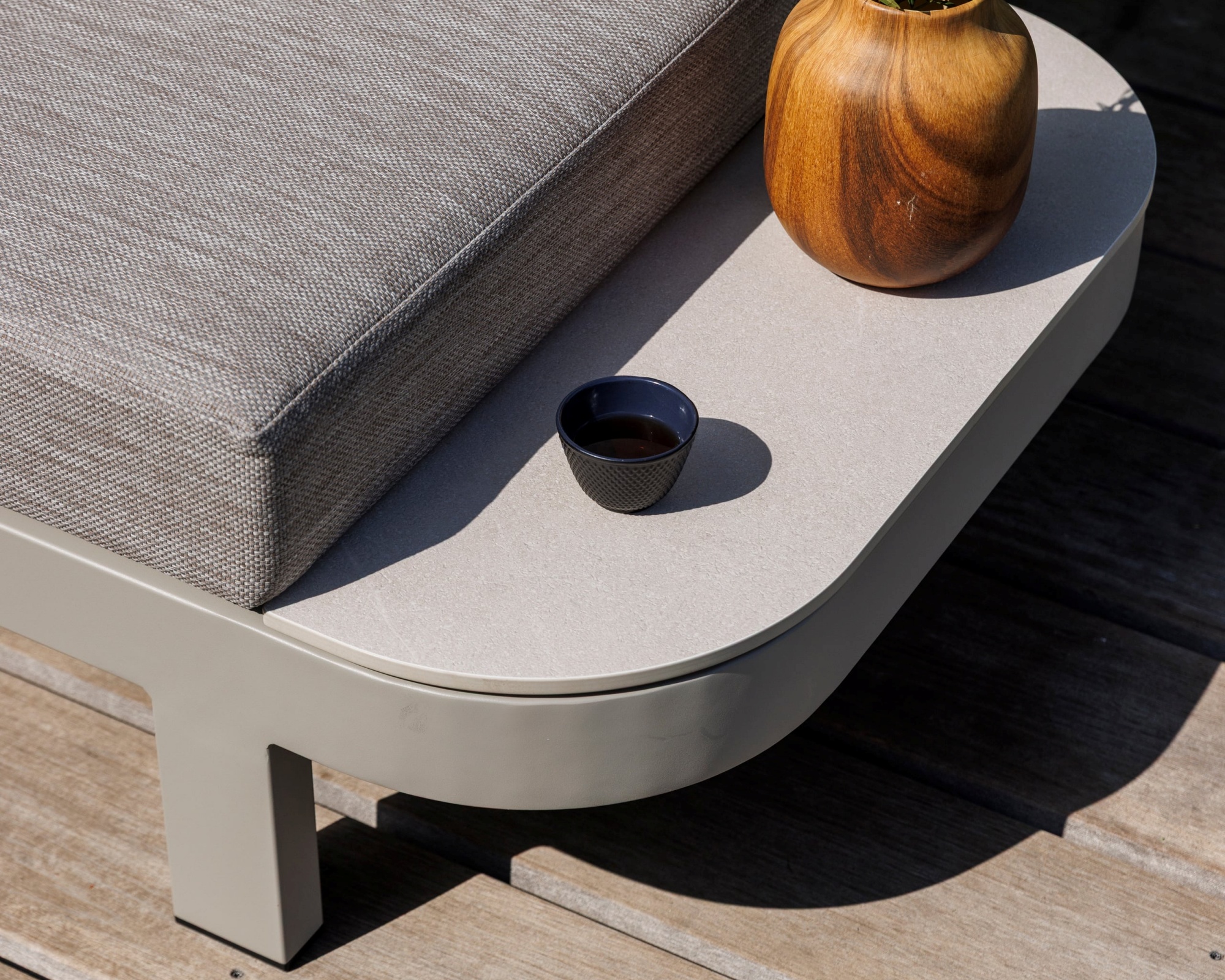 Das robuste Aluminiumgestell und die Tischplatten aus Sinterstein in Ivory machen die Salvador Lounge besonders langlebig, pflegeleicht und witterungsbeständig – ideal für den Einsatz im Aussenbereich.