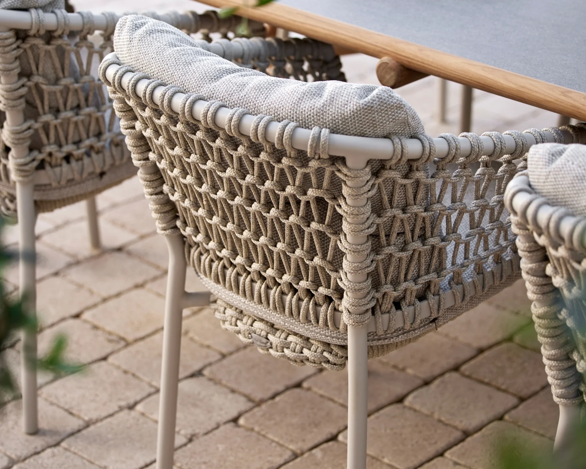 Der fein gearbeitete Aluminiumrahmen in Sand verbindet sich mit der eleganten Rope-Schnürung zu einer leichten, zugleich exklusiven Erscheinung.