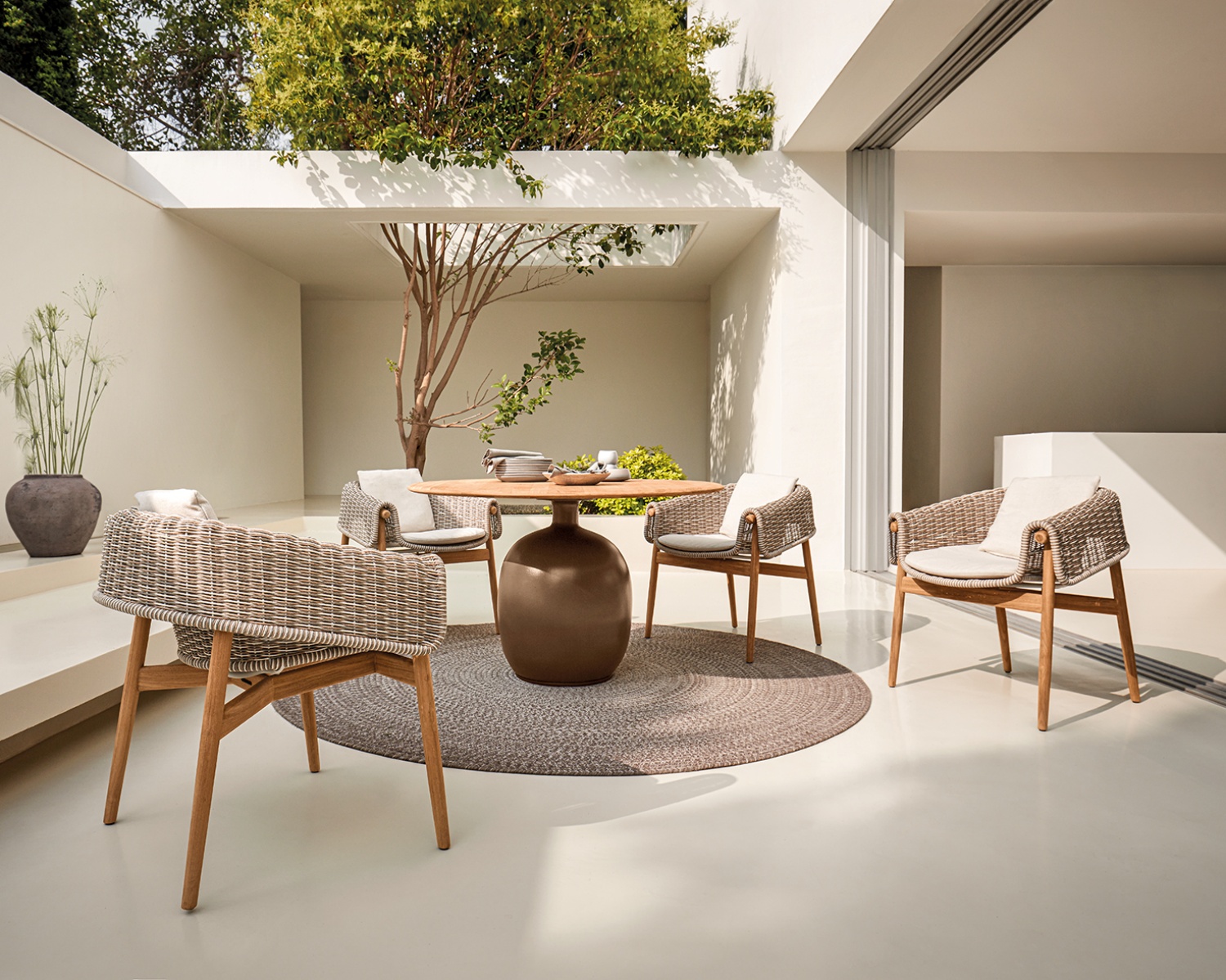 Der nachhaltig gewonnene Teakholzrahmen bildet die warme, natürliche Basis dieser aussergewöhnlichen Kollektion. Ergänzt wird er durch sorgfältig gefertigte Kunstfasern in den Farben Sorrel oder Umbra, die nicht nur elegant wirken, sondern auch besonders wetter- und UV-beständig sind. Für zusätzlichen Komfort sorgen die hochwertigen Outdoor-Polster, die perfekt auf das Design abgestimmt sind.