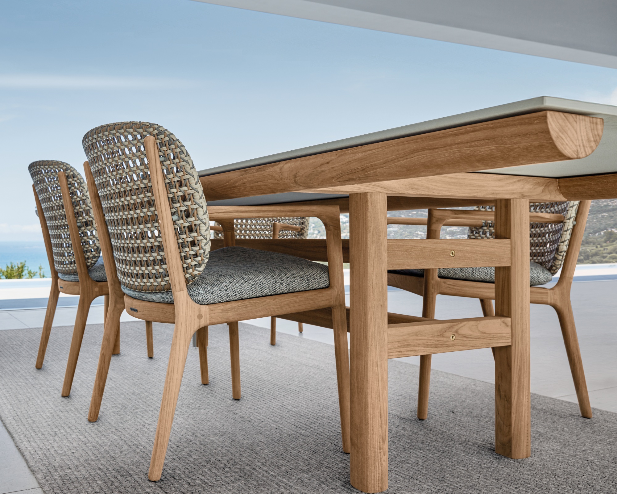 Inspiriert von Glosters langer Handwerkskunst in der Teakmöbelherstellung besteht das Gestell aus sorgfältig ausgewähltem, handveredeltem und nachhaltig gewonnenem Teakholz. Die 12 mm starken, strukturierten Keramik-Tischplatten in der Farbe Grigio verleihen dem Tisch eine moderne, elegante Note und bilden einen stilvollen Kontrast zum natürlichen Holz.
