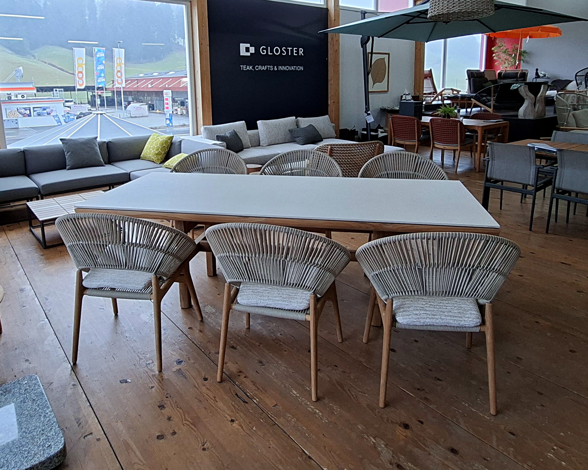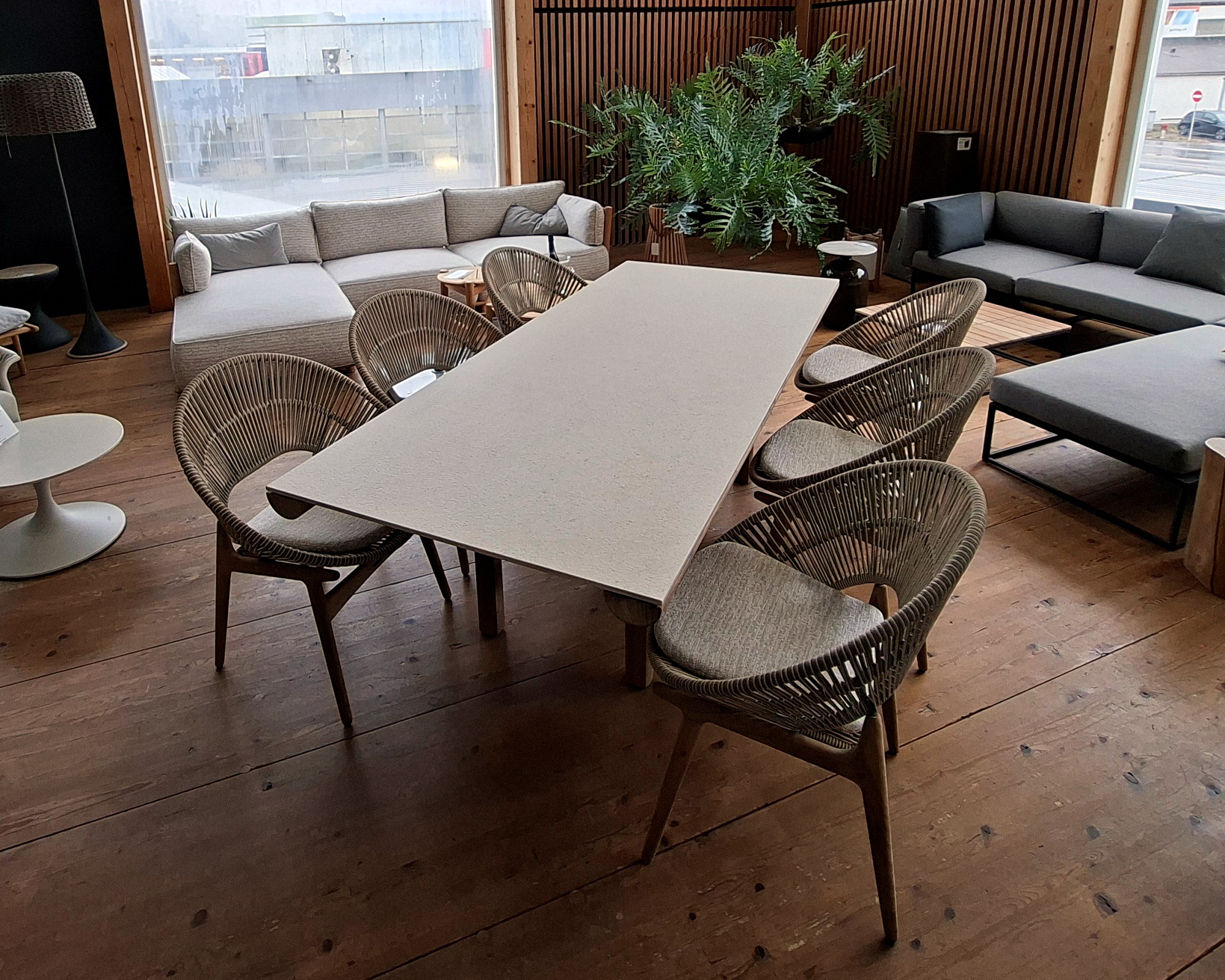 Abgerundet wird das Set durch den aussergewöhnlichen Gartentisch Rail mit einer Keramikplatte in der Ausführung Veron und einem robusten Gestell aus Teakholz. Die Kombination aus Teakholz, Keramik und handgefertigten Kunstfasern schafft ein harmonisches Gesamtbild, das Eleganz, Langlebigkeit und höchsten Sitzkomfort vereint – perfekt für stilvolle Garten- und Terrassenbereiche.