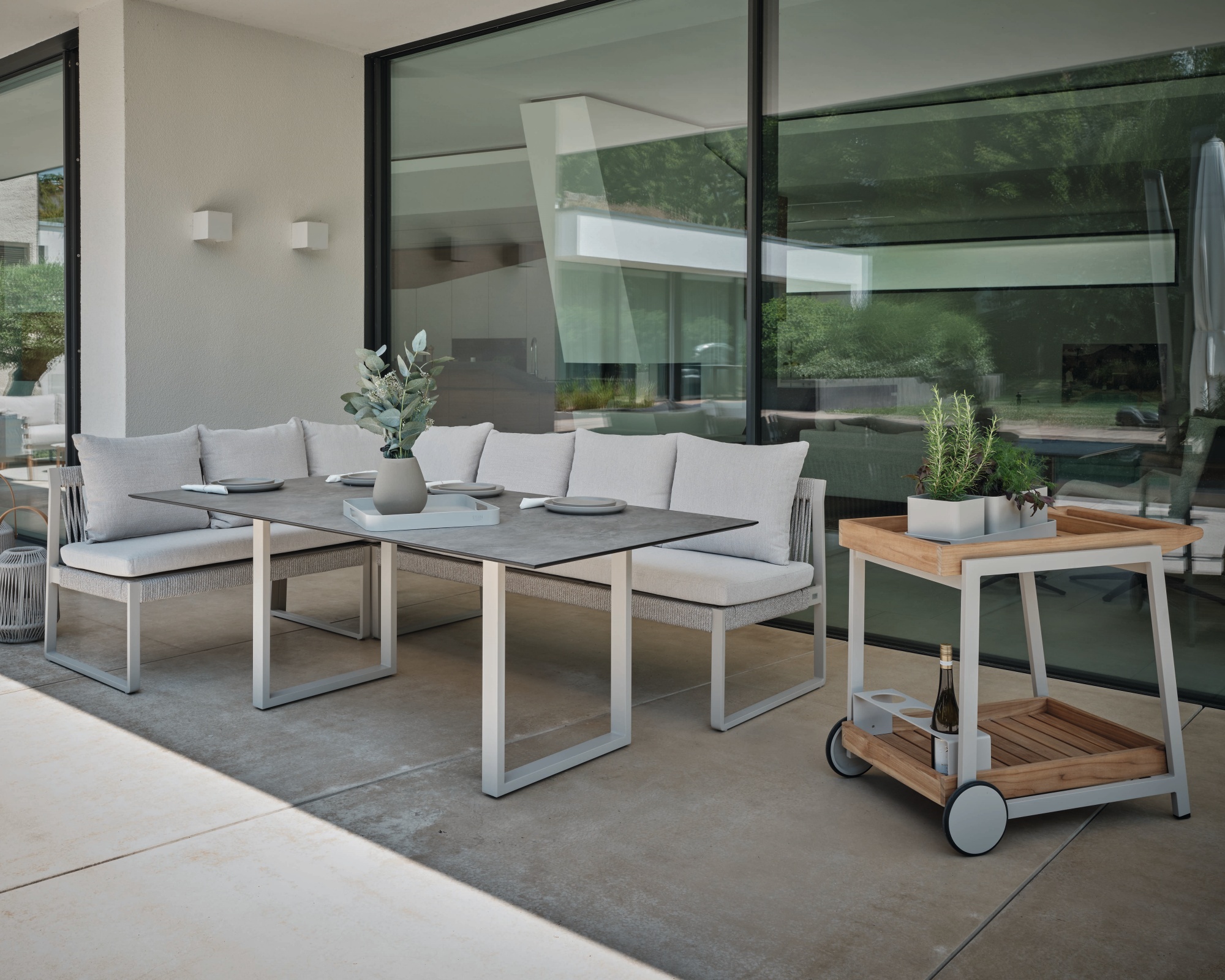 Besonders harmonisch lässt sich die Bank mit dem Kufentisch Miguel aus dem Hause Stern® kombinieren. Die klare Formensprache und hochwertigen Materialien sorgen nicht nur für einen eleganten Look, sondern auch für Langlebigkeit im Outdoor-Bereich.