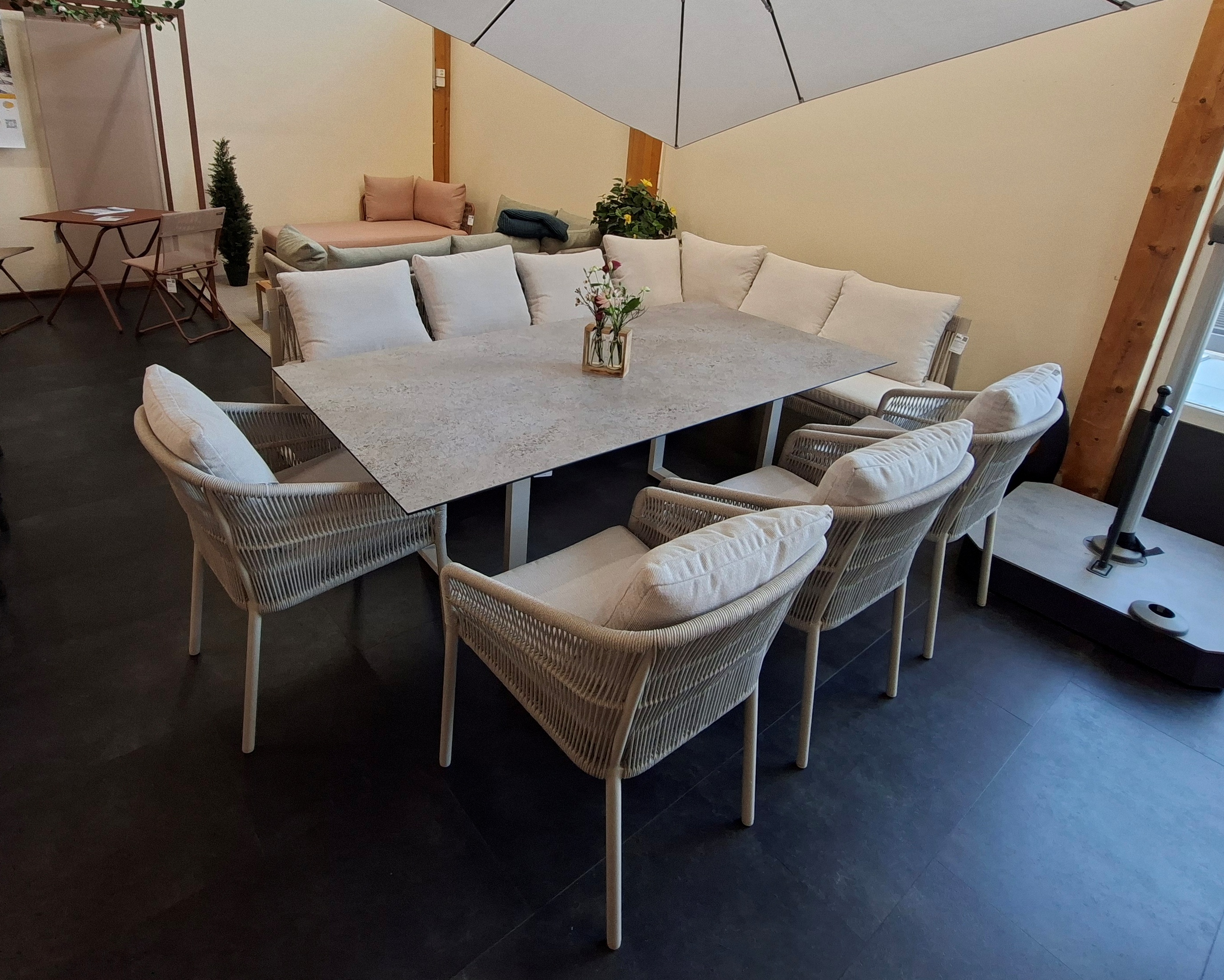 Gemütlichkeit trifft Funktion – die Tischgruppe Tammo in Greige. Ob Familienfeier oder gemütliches Abendessen im Freien – mit der Tischgruppe Tammo sind Sie bestens ausgestattet. Die stilvolle Eckbank in modernem Greige bietet grosszügig Platz und schafft eine gesellige Atmosphäre – ideal, wenn spontan mehr Gäste kommen.