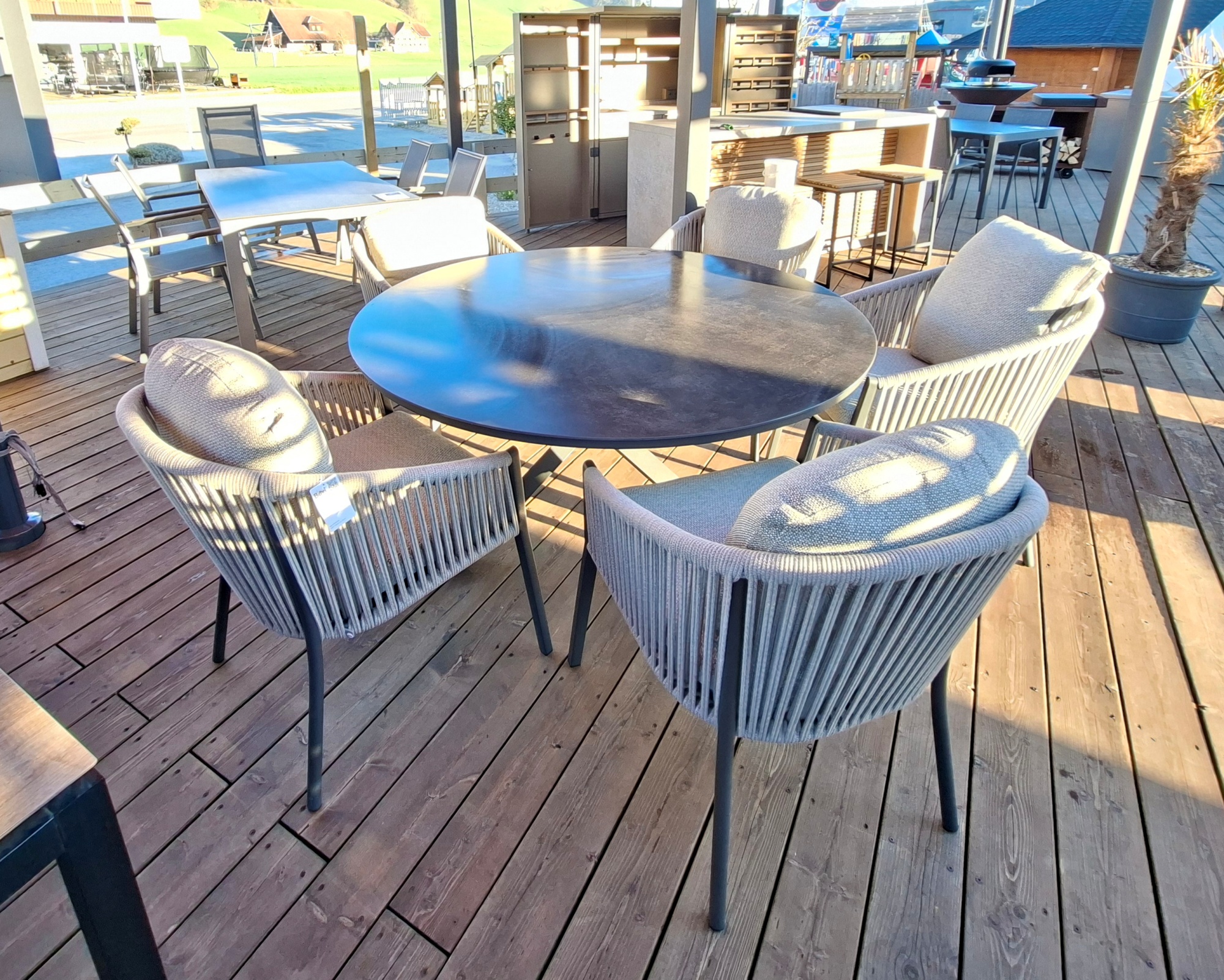 Die Tischplatte des Tripodi Gartentisches besteht aus Keramik in Deep Dark. Das Material hat sich in den letzten Jahren zu DER Tischplatte für den Aussenbereich gemausert. Keramik ist äusserst hart und dicht in der Oberfläche was nahezu keine Feuchtigkeit aufnimmt, kratzfest und säurebeständig. Abgerundet wurde das Tisch Set mit dem Gartenstuhl Avero, er sorgt für den Hingucker in Ihrem Aussenbereich.