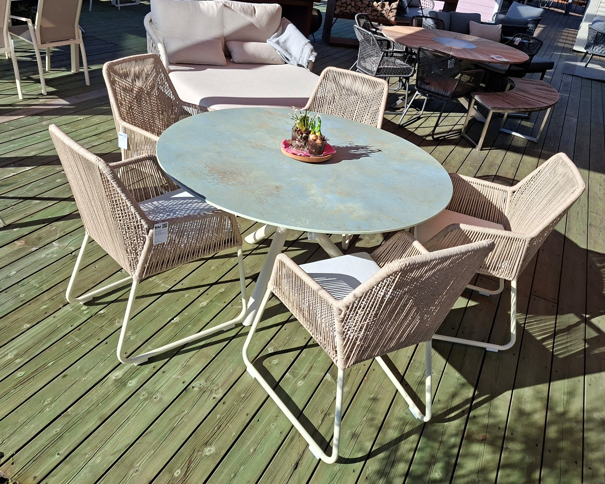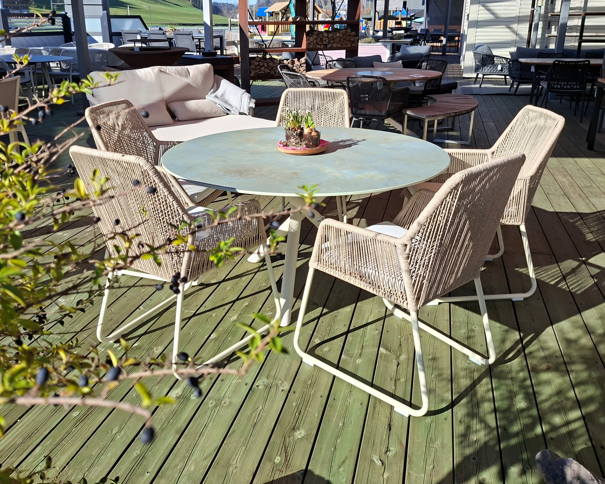 Das Gartentisch-Set Tubo – Allanis überzeugt mit einer runden Tischplatte in 140 cm Durchmesser und einer hochwertigen Dekton-Platte in Ossido (12 mm). Mit seiner klaren Formensprache wird der Tisch zum stilvollen Mittelpunkt im Outdoor-Bereich.