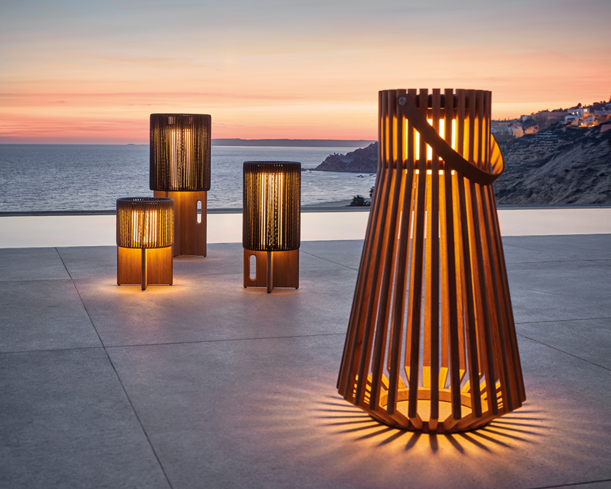 Ein praktisch integrierter Griff ermöglicht das mühelose Tragen und Platzieren der Leuchte – ob neben der Lounge-Gruppe, auf dem Gartentisch oder entlang von Wegen. Die Compass ist in drei Grössen erhältlich und bietet flexible Einsatzmöglichkeiten.