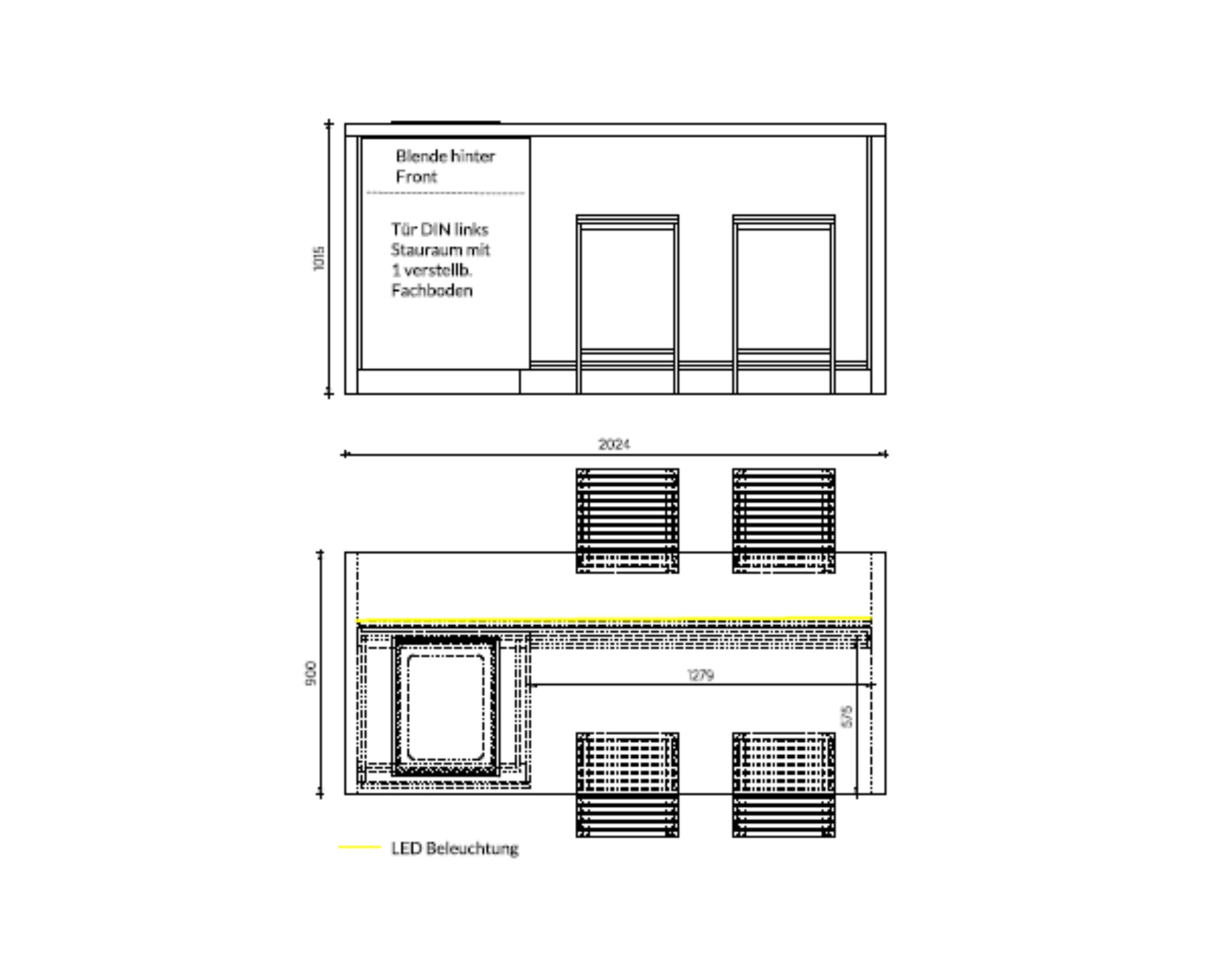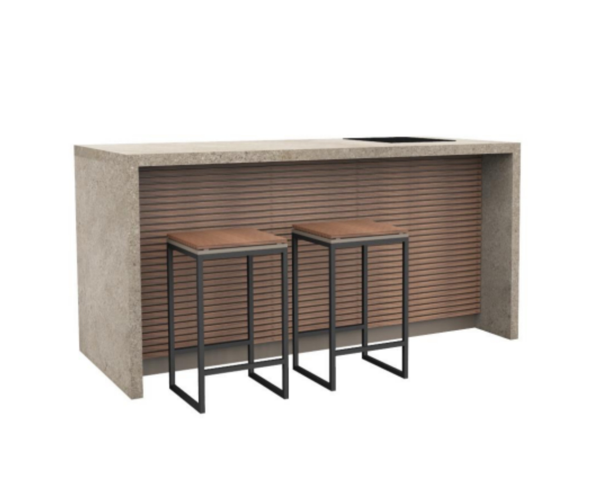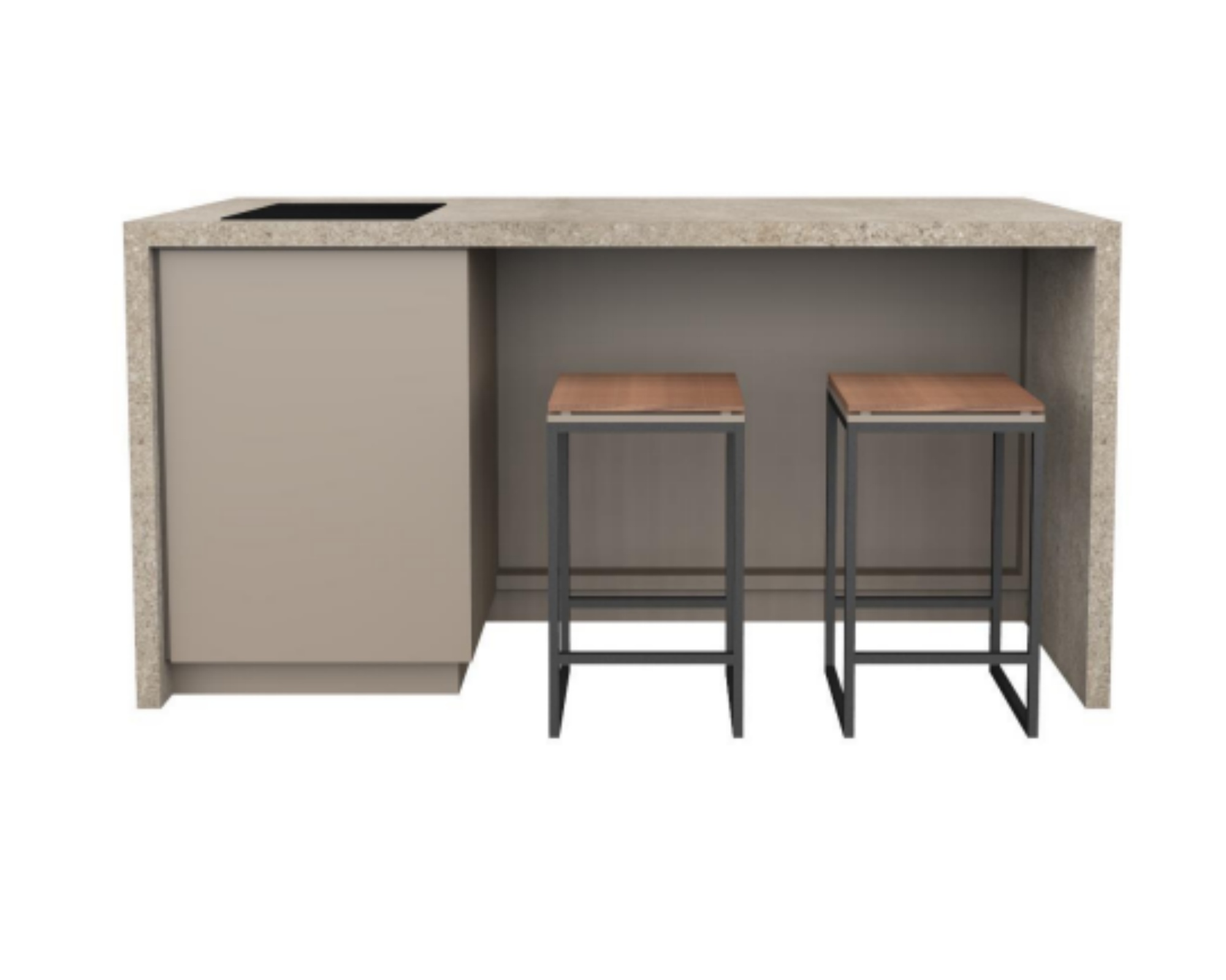 Auf der linken Seite des Korpus befinden sich zwei bequeme Sitzplätze für Barstühle. Die vordere Lamellenverkleidung ist leicht zurückversetzt, um ein angenehmes Sitzen zu ermöglichen. Gegenüberliegend können ebenfalls zwei Personen Platz nehmen – so entsteht eine gemütliche Runde für bis zu vier Gäste.