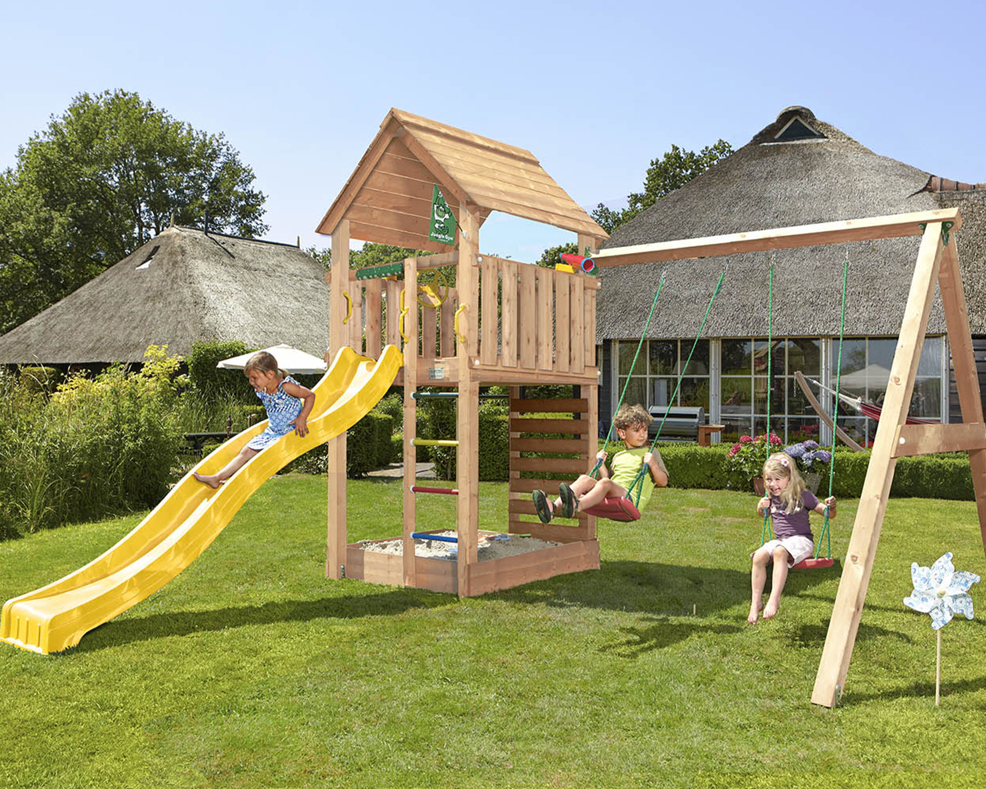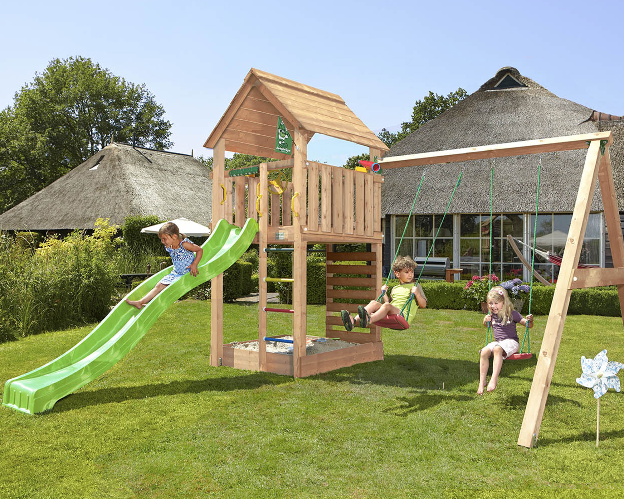 Der attraktive Spielturm Cabin Douglasie mit einem Holzdach und zwei Aufstiegsleitern, ausgerüstet mit einem Fernglas, bietet einen guten Überblick über den Garten.