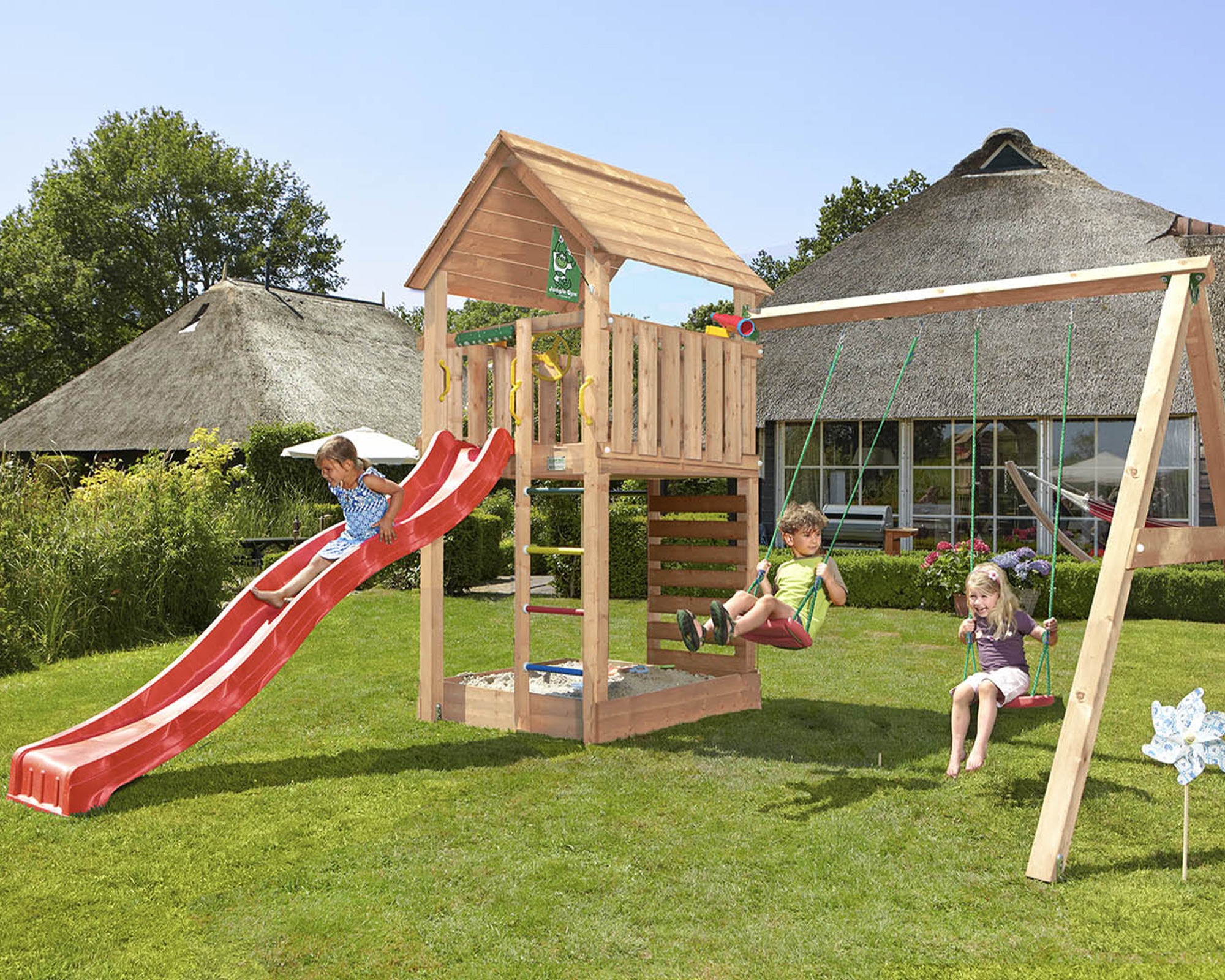 - ³ Zusammenbau: Der Spielturm wird komplett zusammengebaut auf dem frei zugänglichen Garten inkl. Beton exkl. Sand und Anfahrtskosten