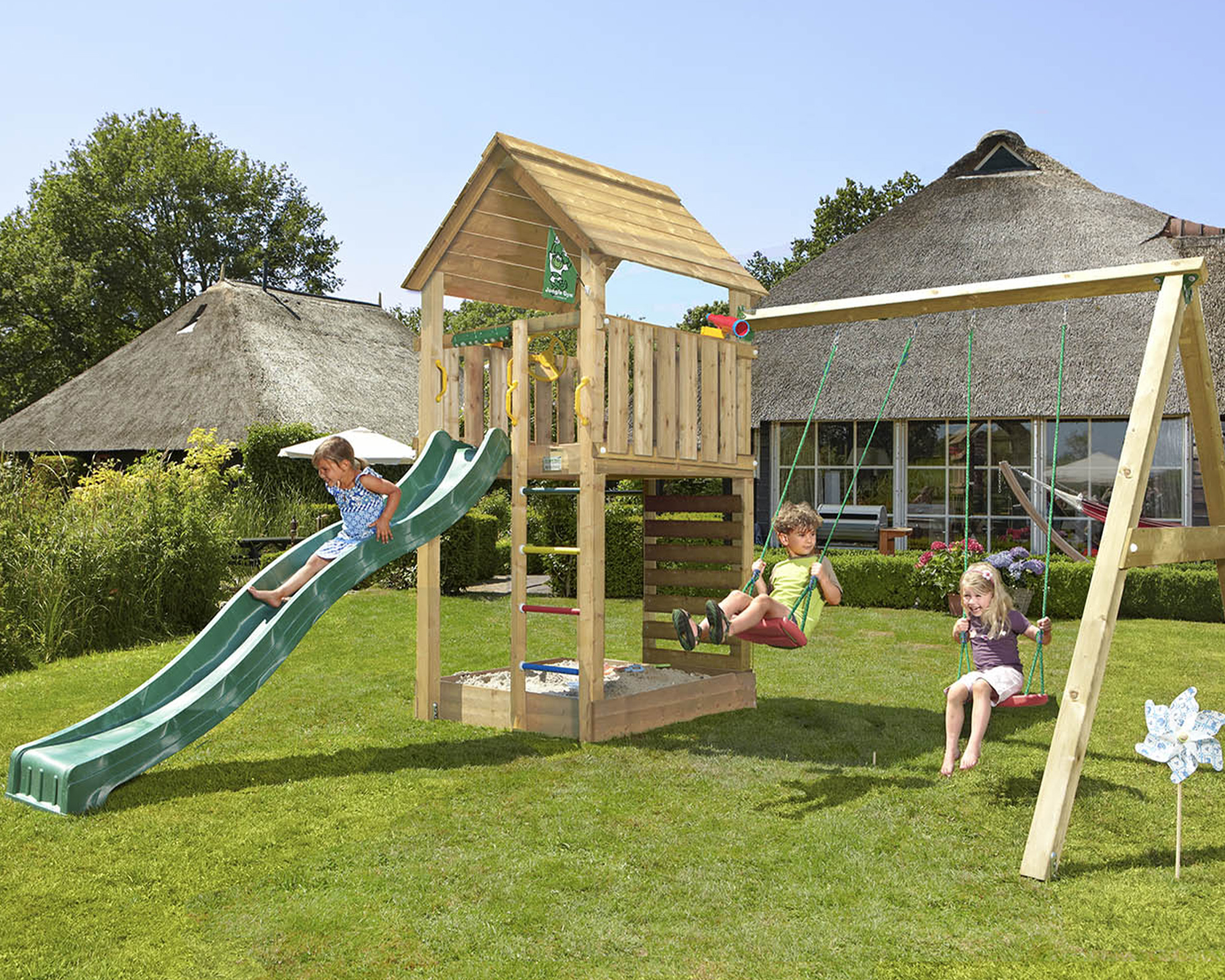 - Ein attraktiver Spielturm mit einer 2-teiliger Anbauschaukel