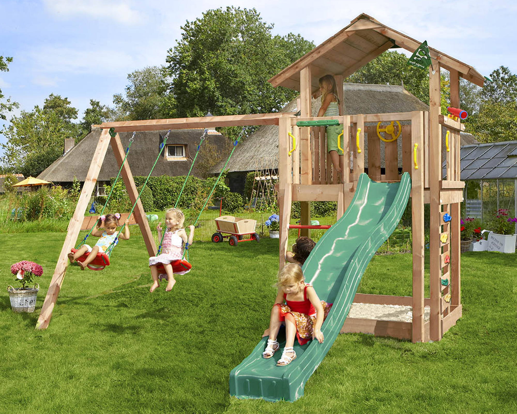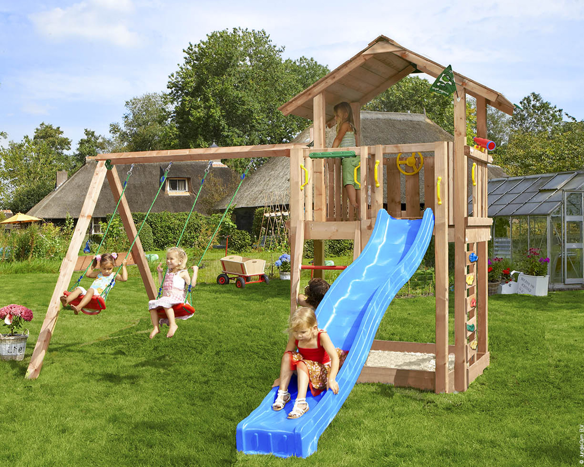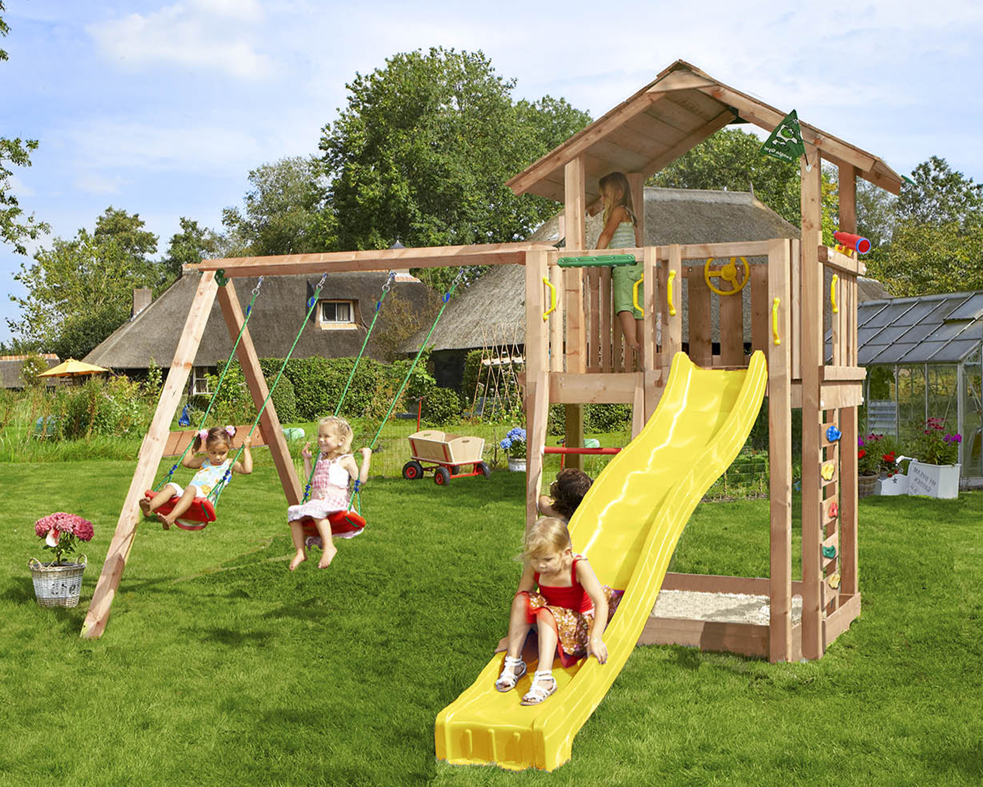 Unser vielseitiger Spielturm Chalet Douglasie mit 2-teiliger Anbauschaukel Jungle Gym ist massiv und robust, um viele Jahre ausgelassenes Spiel im Privatgarten zu überstehen.