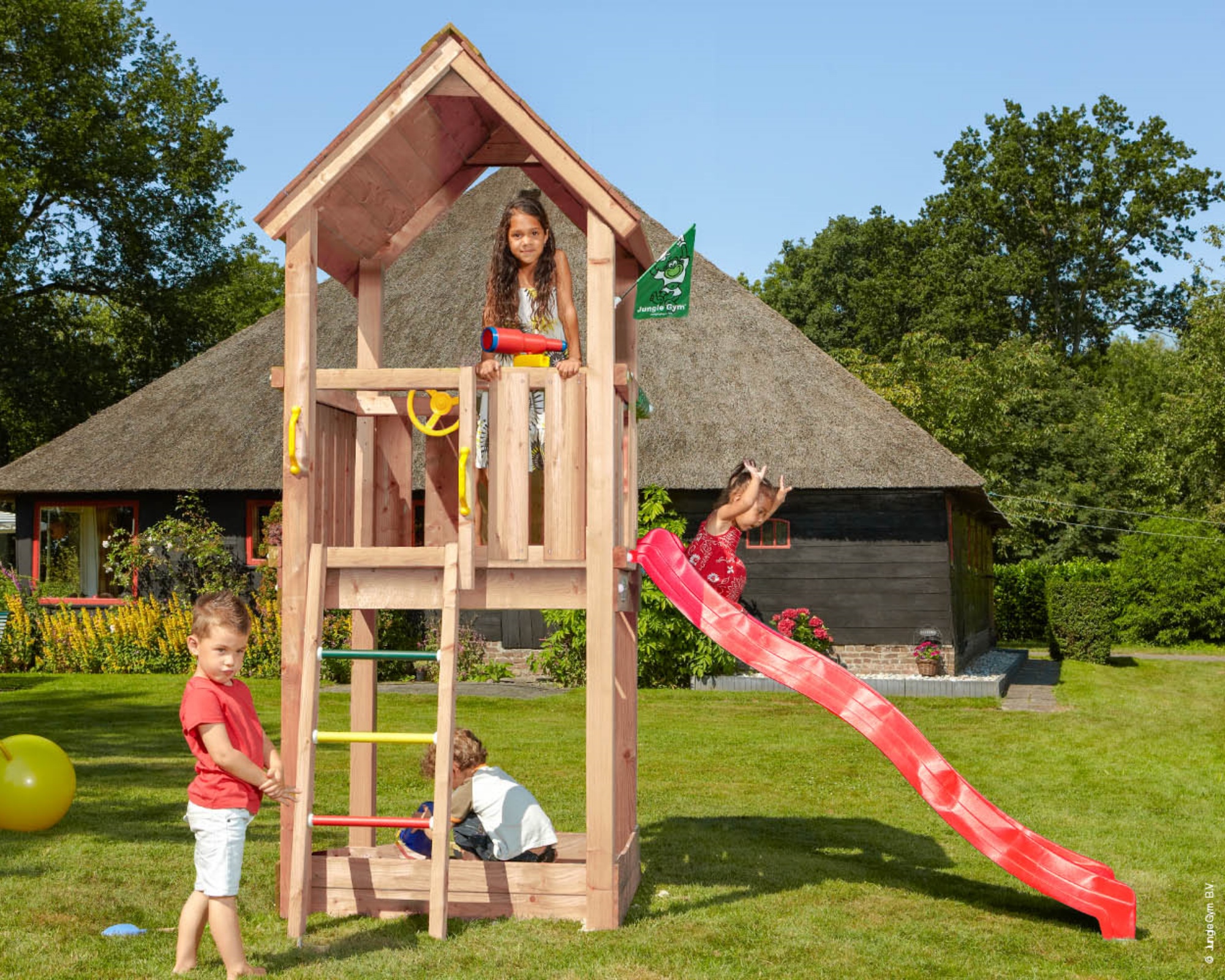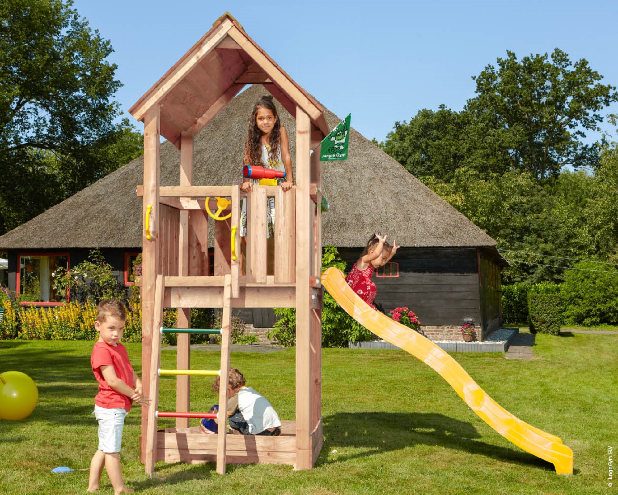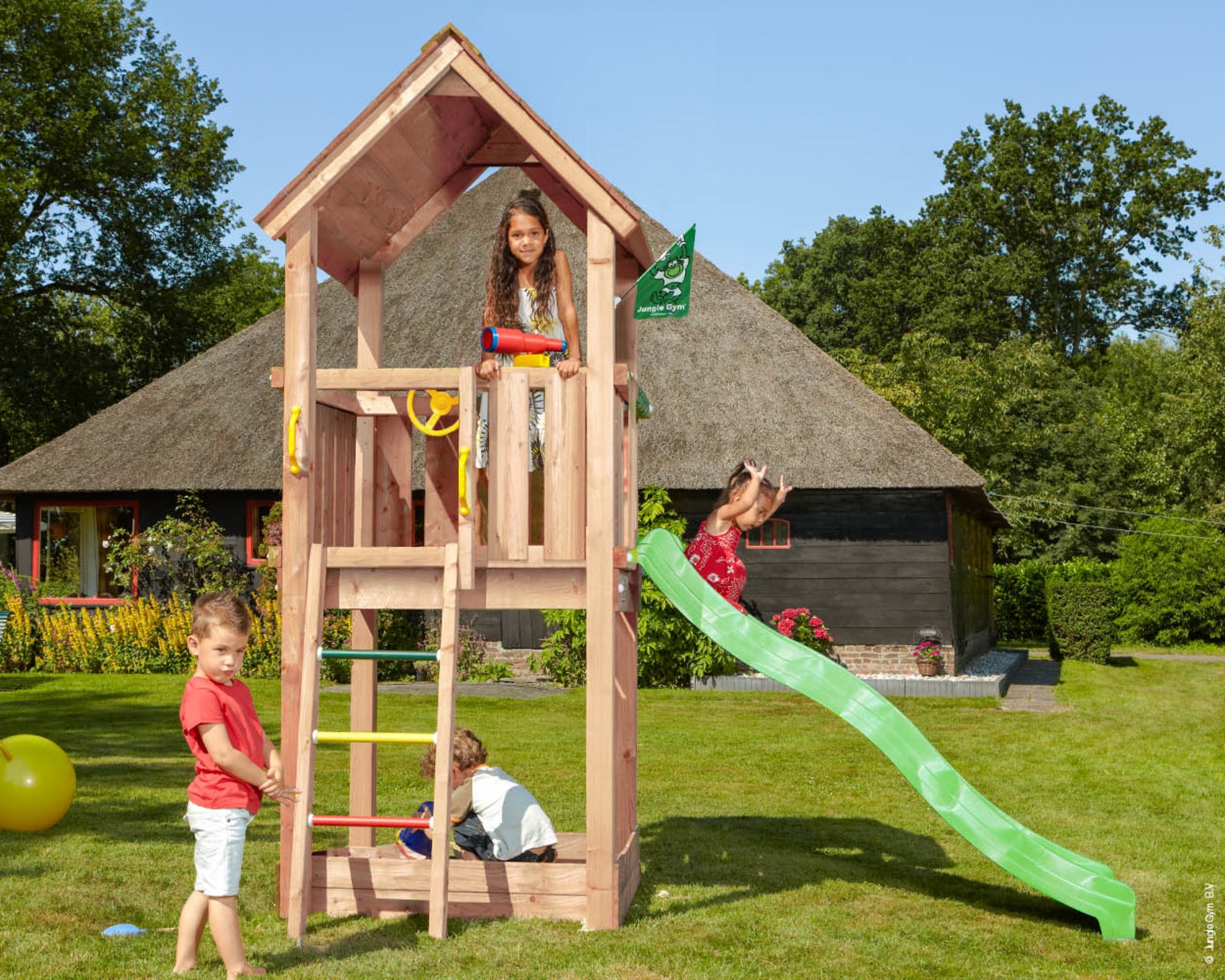 - ³ Zusammenbau: Der Spielturm wird komplett zusammengebaut auf dem frei zugänglichen Garten inkl. Beton exkl. Sand und Anfahrtskosten