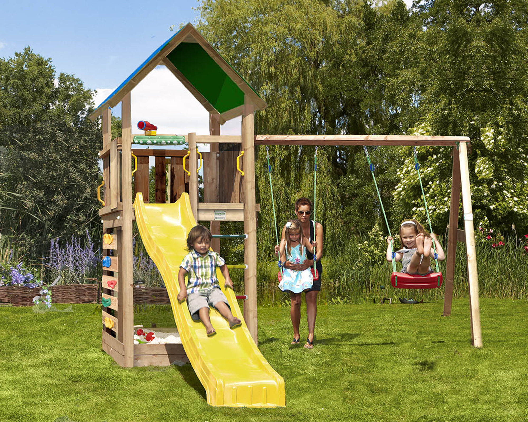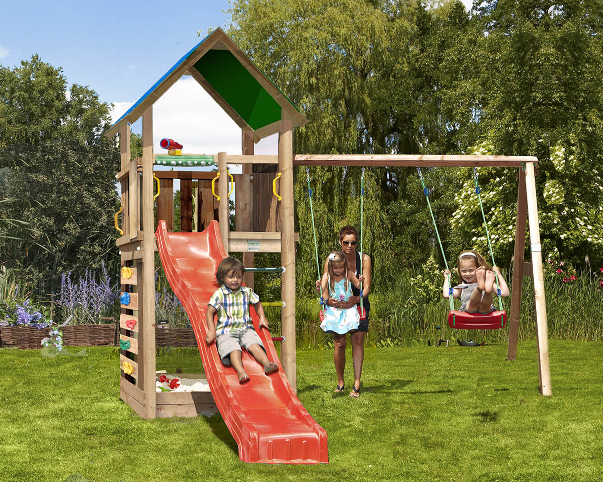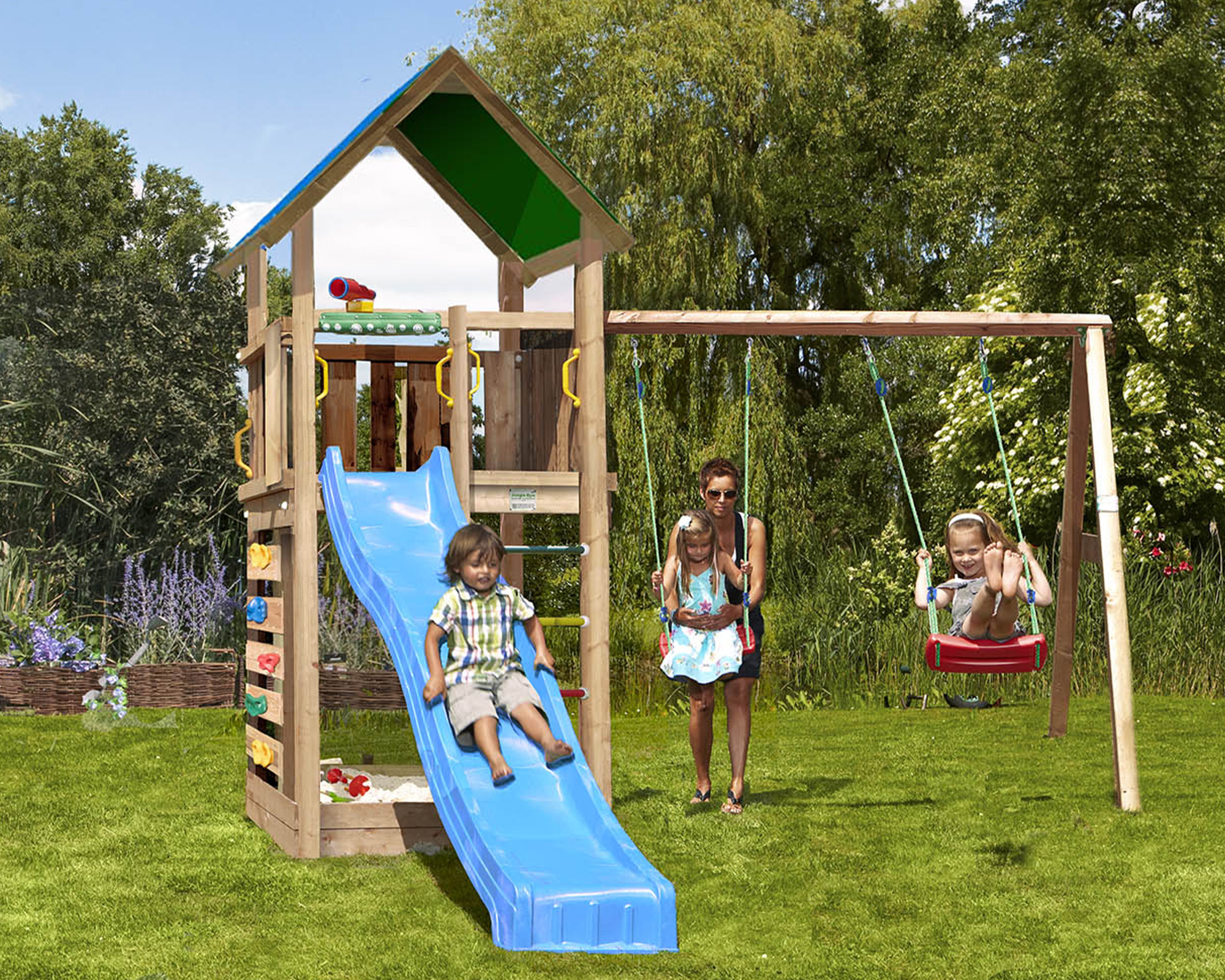 - inkl. Konstruktionsholz CH-Douglasie, Handwerker Bausatz und HDPE Rutsche und 2-teiliger Anbauschaukel inkl. JG Schaukelzubehör