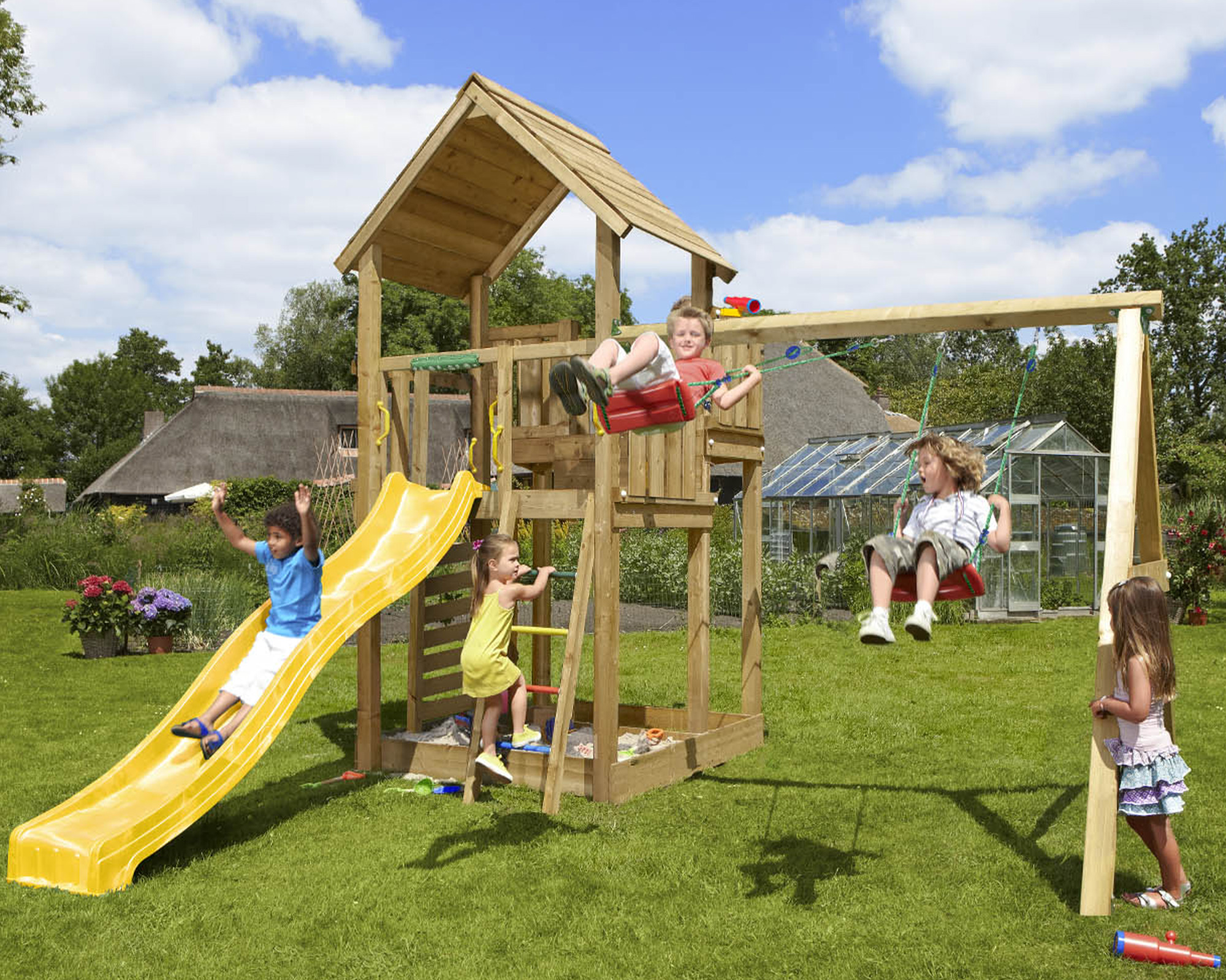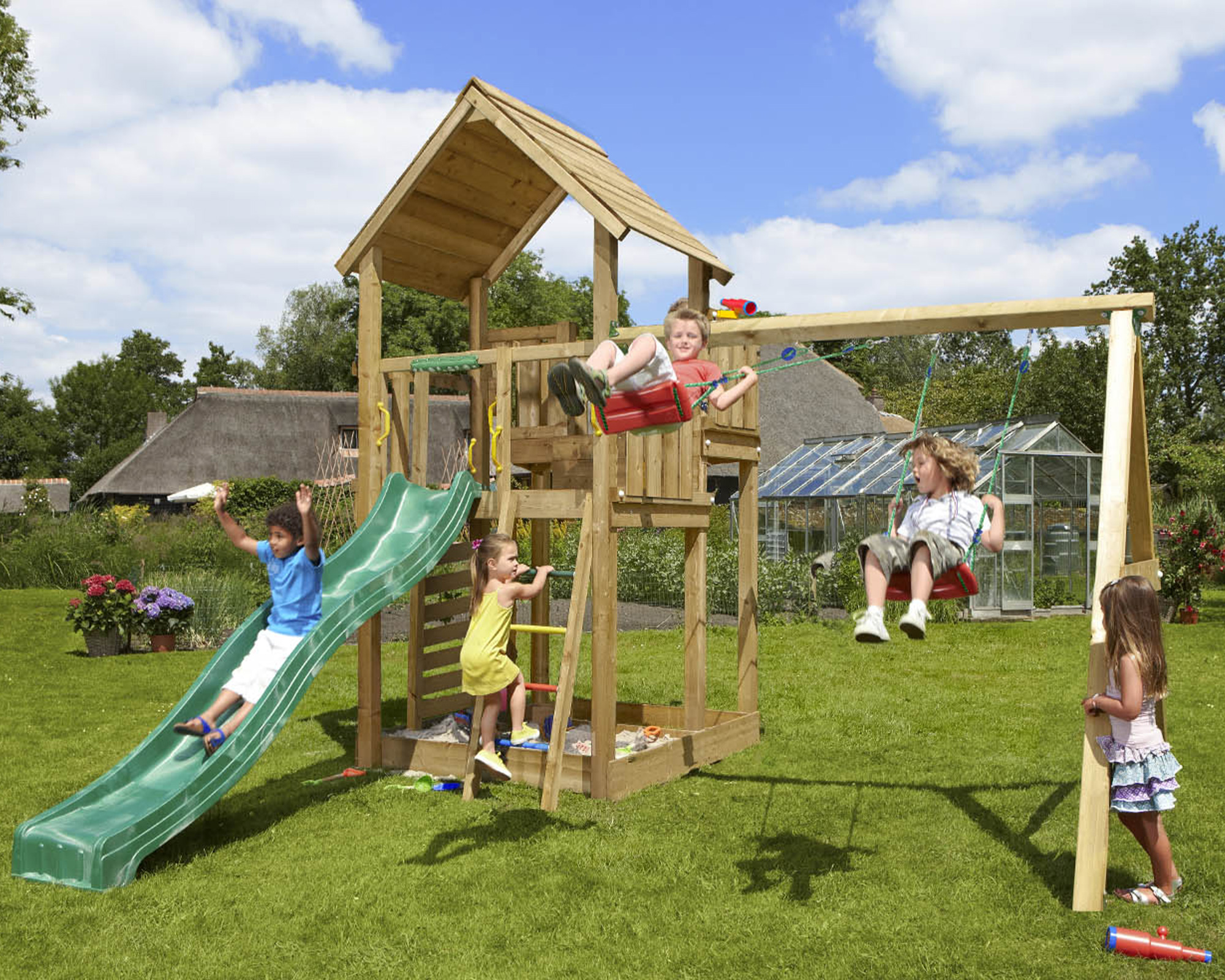 - ³ Zusammenbau: Der Spielturm wird komplett zusammengebaut auf dem frei zugänglichen Garten inkl. Beton exkl. Sand und Anfahrtskosten