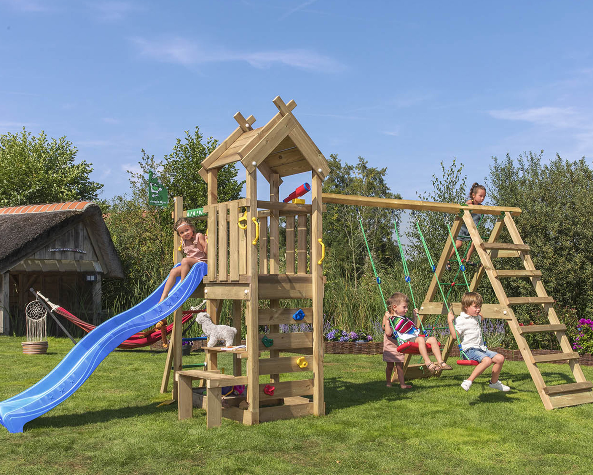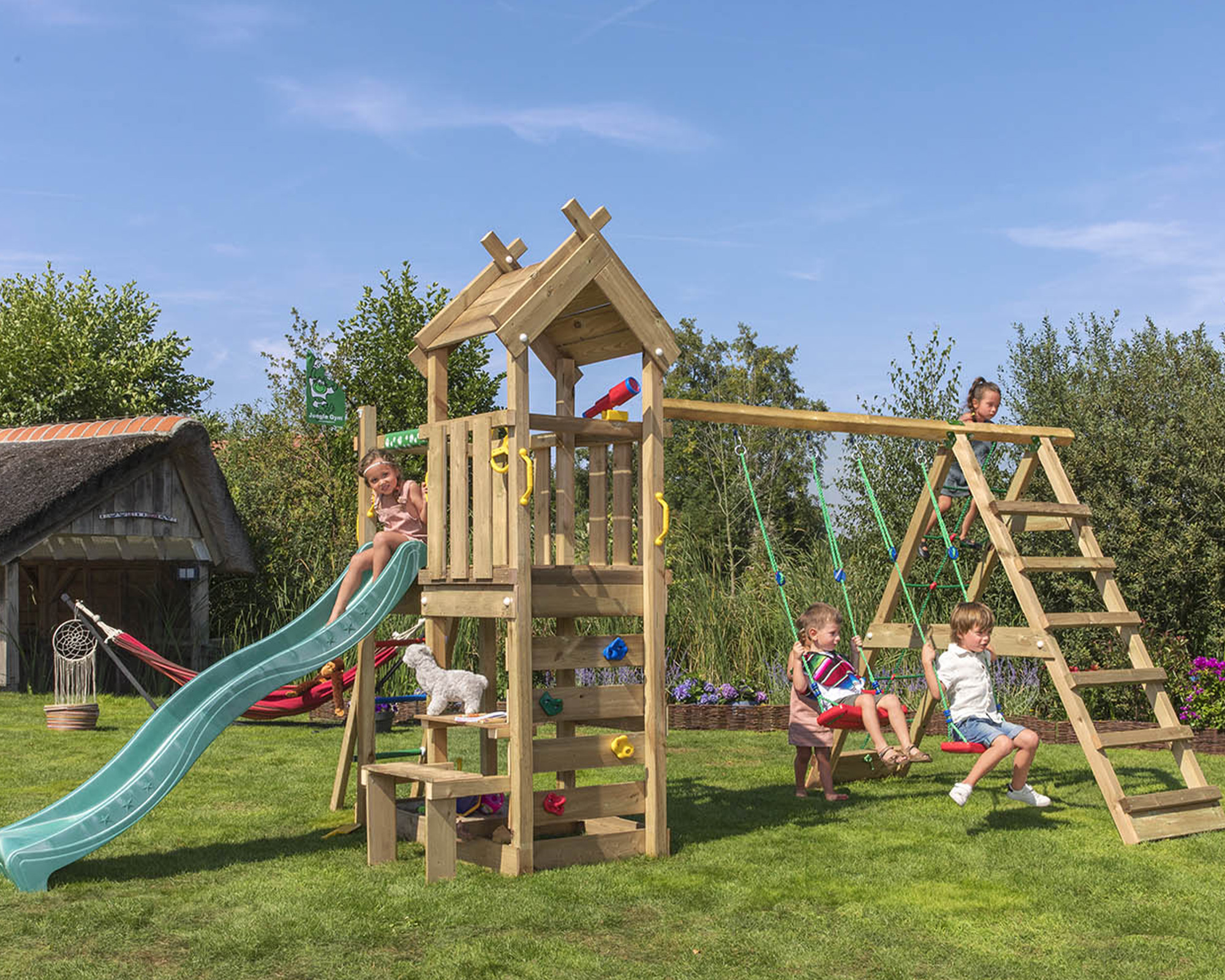 Der charmante Spielturm Teepee Fichte mit Climb Modul 200 2-teilig Jungle Gym im Country-Look mit witzigem Tipi-Holzdach für Ihre Kinder.