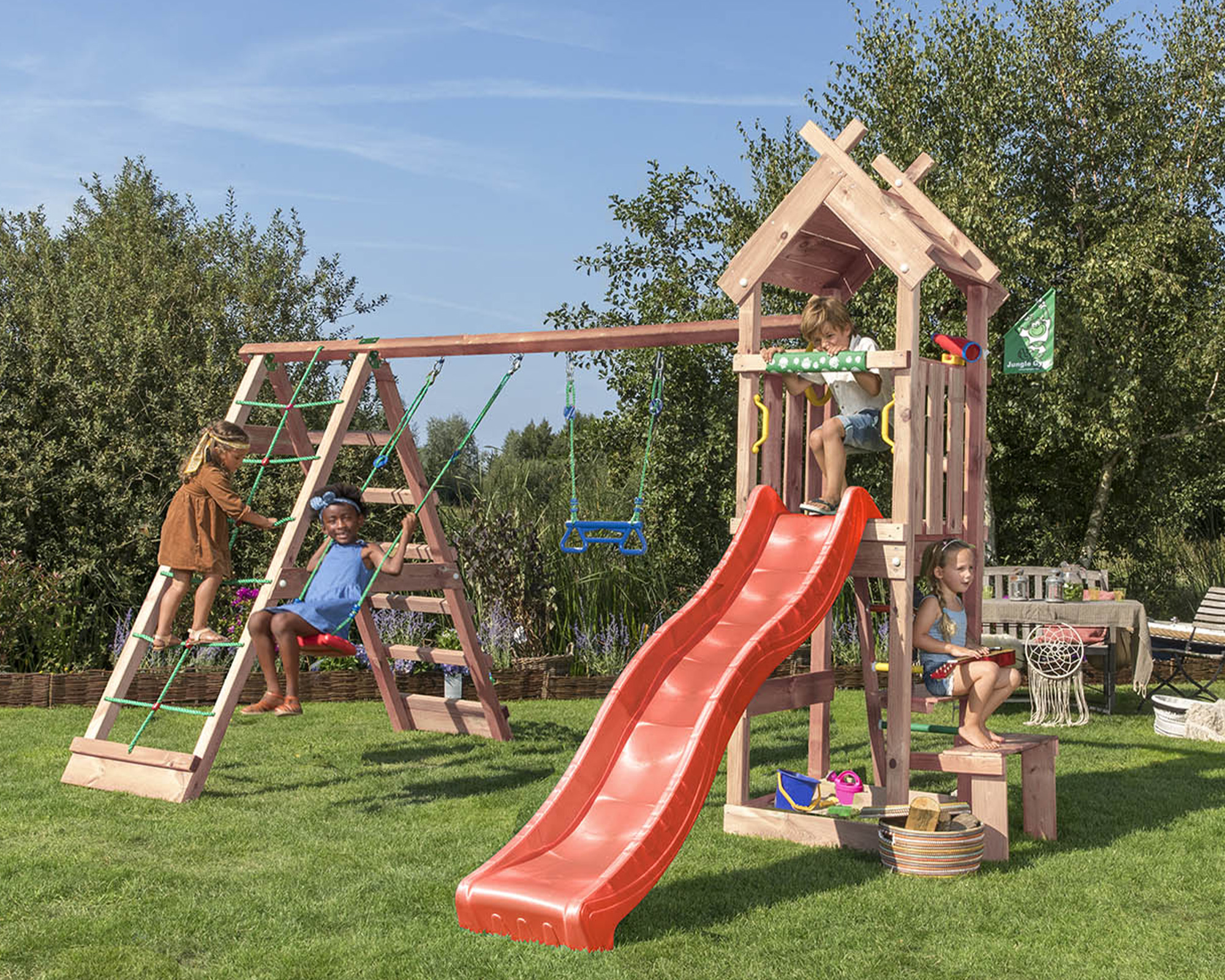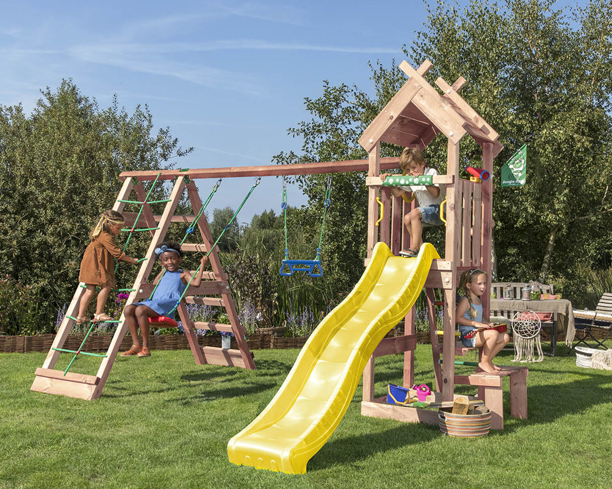 Der Spielturm Totem Douglasie mit seinem originellen Holzdach zieht der Spielturm alle Blicke im Garten auf sich.