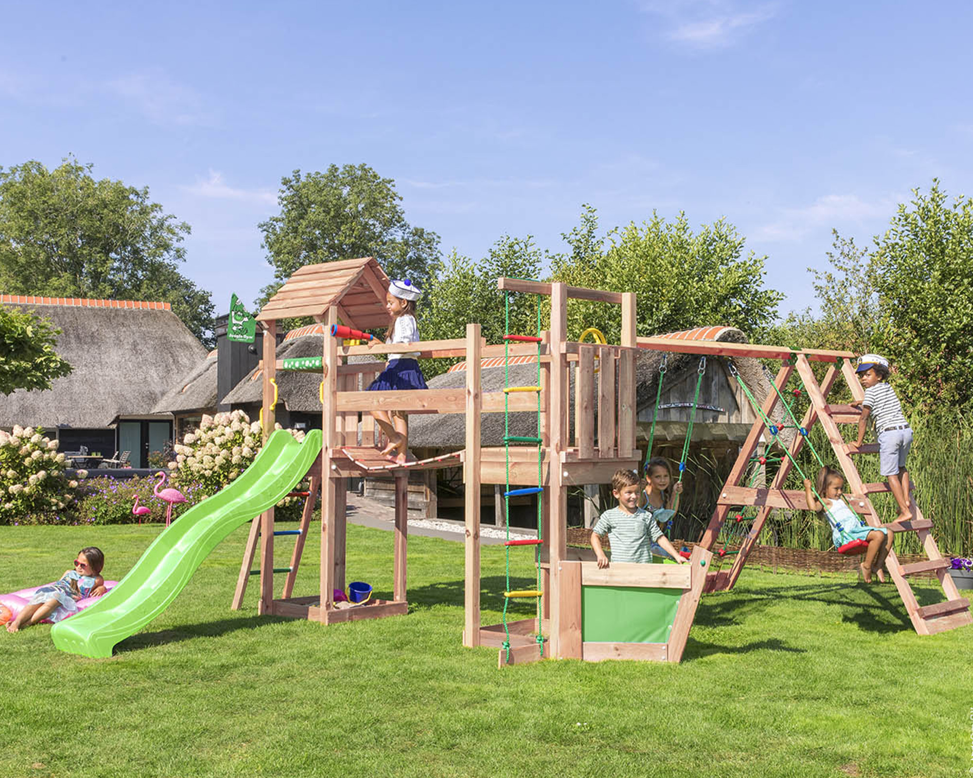 Der Spielturm Voyager Douglasie Jungle Gym - Ein kreativer Doppelspielturm mit Schiffsbug und Hängebrücke.