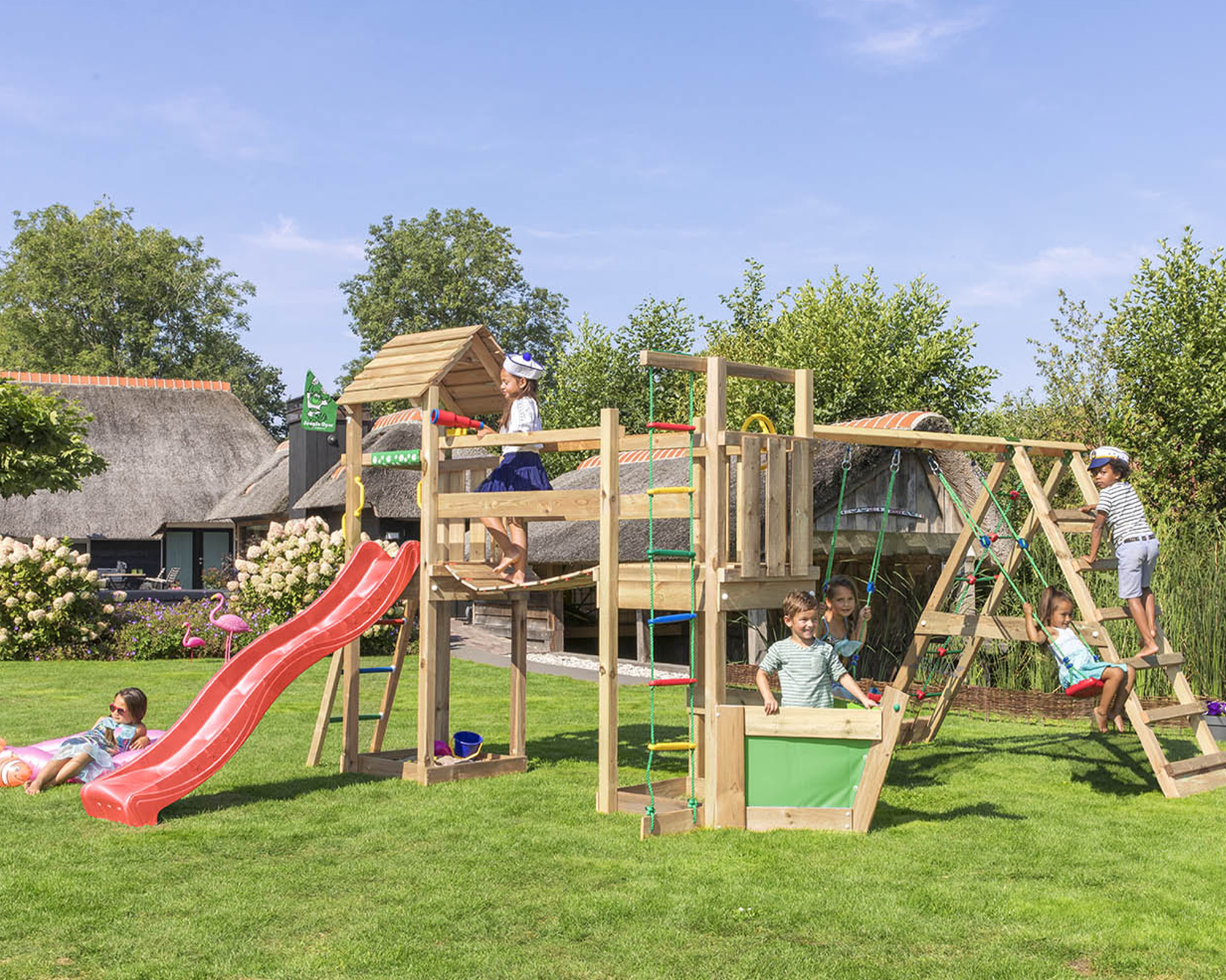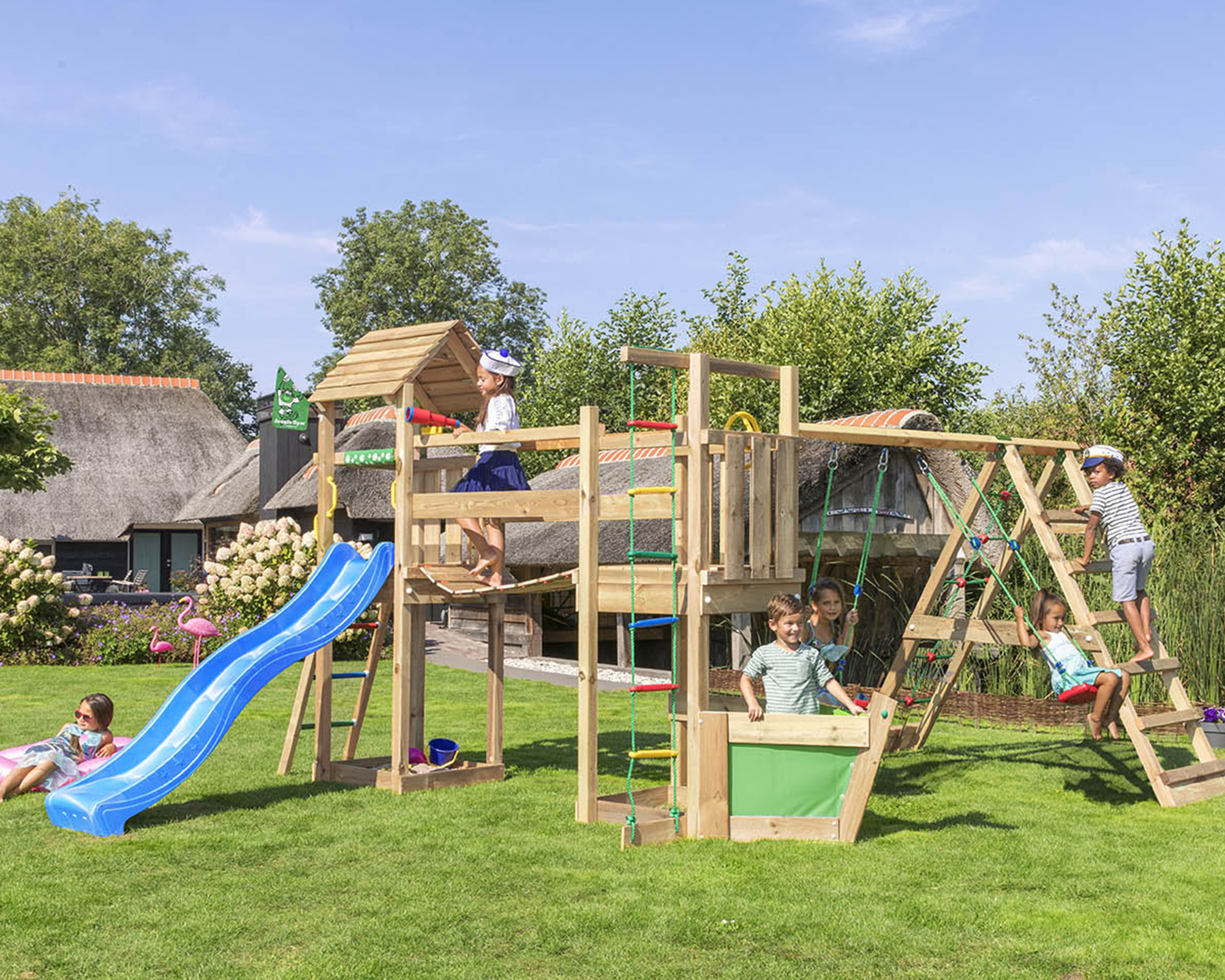 Der Spielturm Voyager Fichte Jungle Gym - Ein kreativer Doppelspielturm mit Schiffsbug und Hängebrücke.