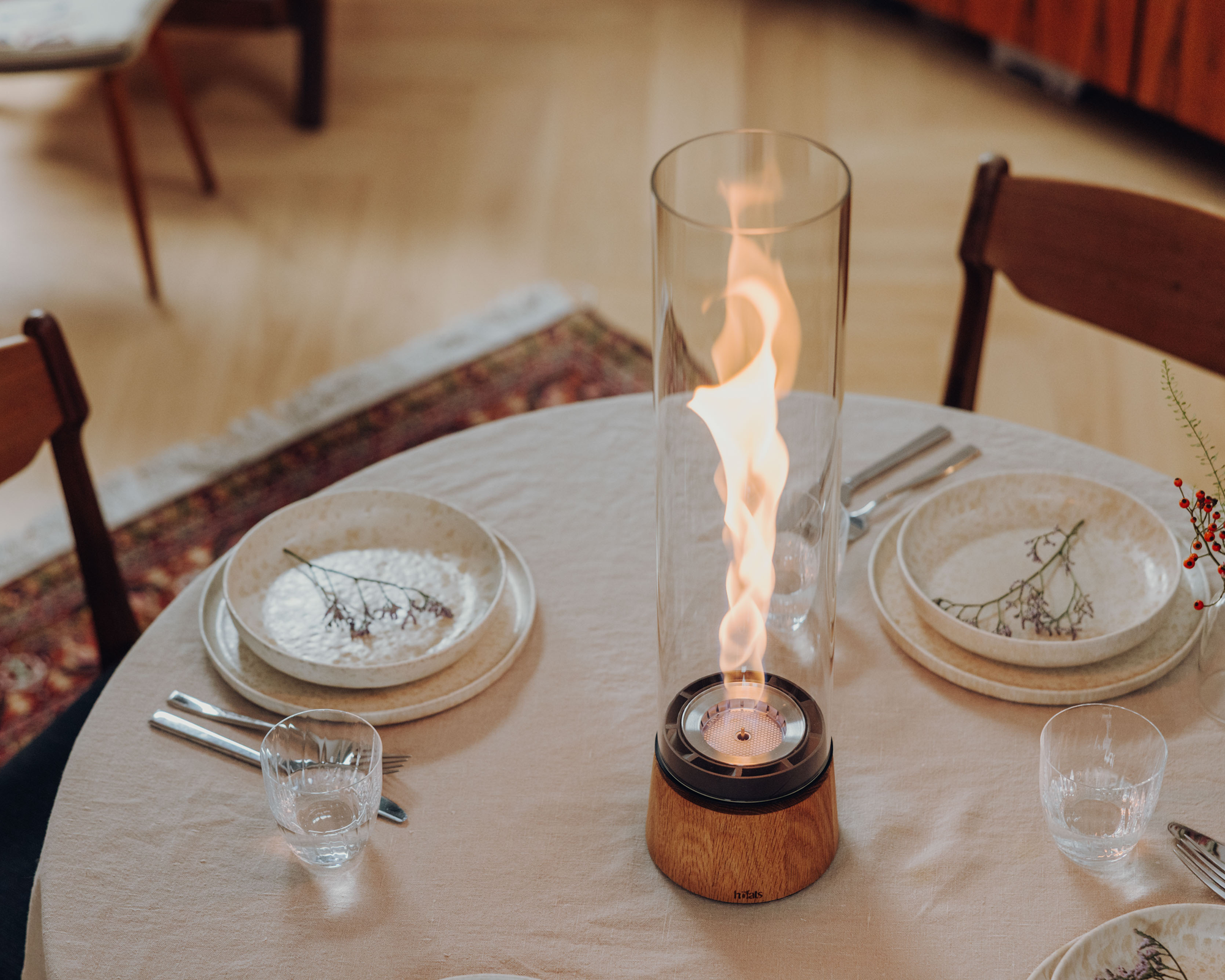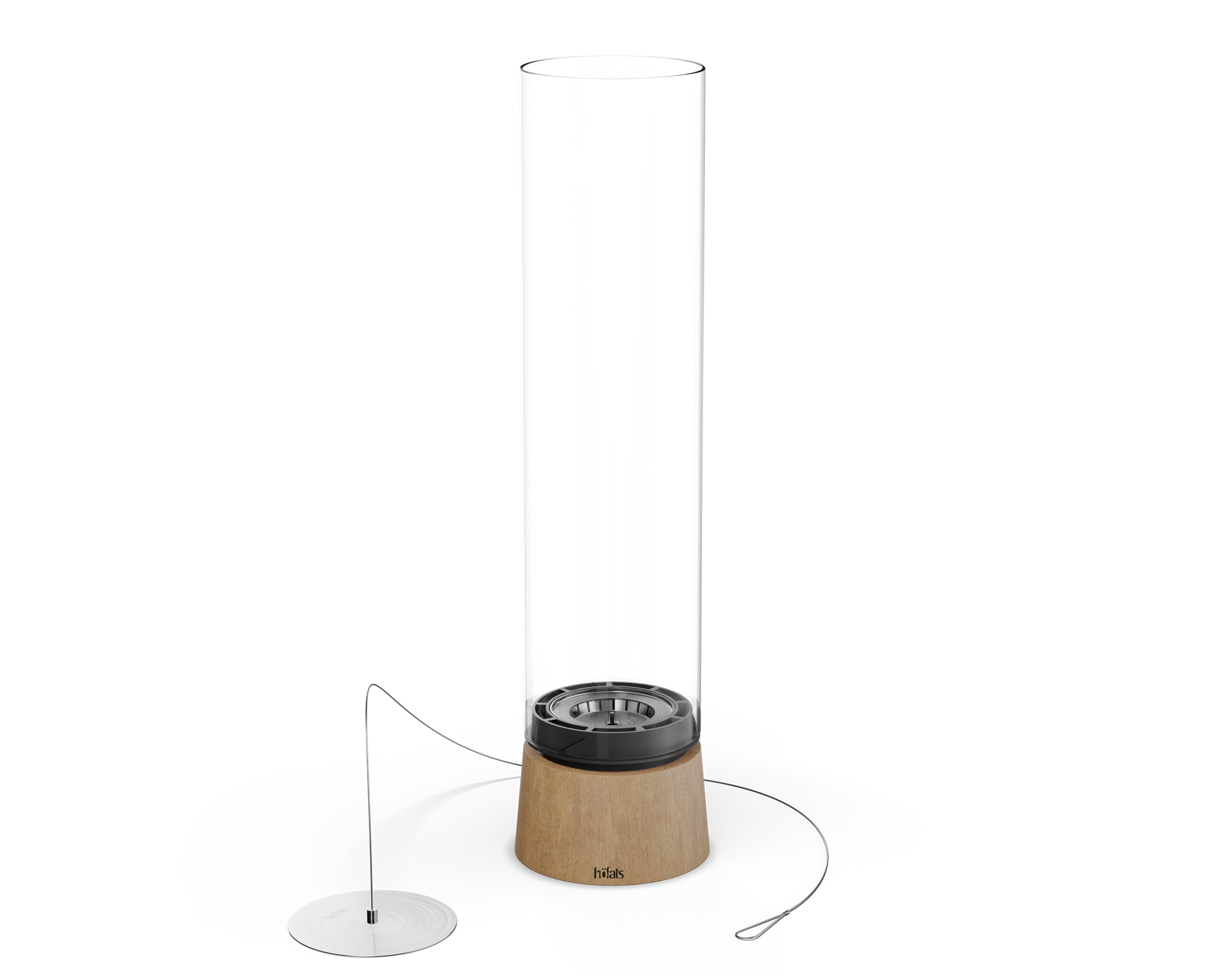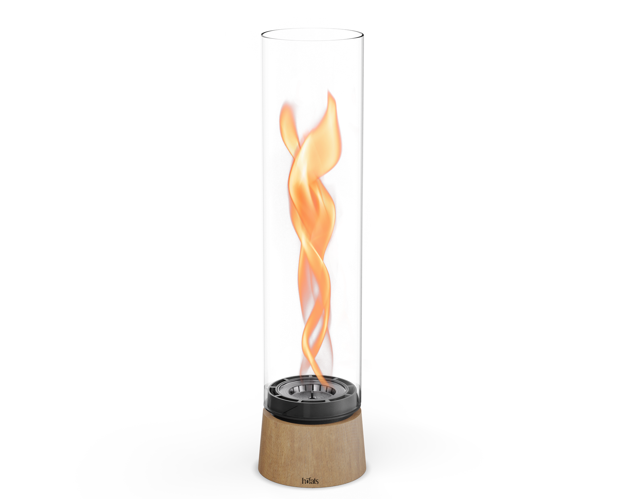 - Tischfeuer SPIN air, Fuss Stahlguss/Holz, Zylinderglas Borosilikatglas