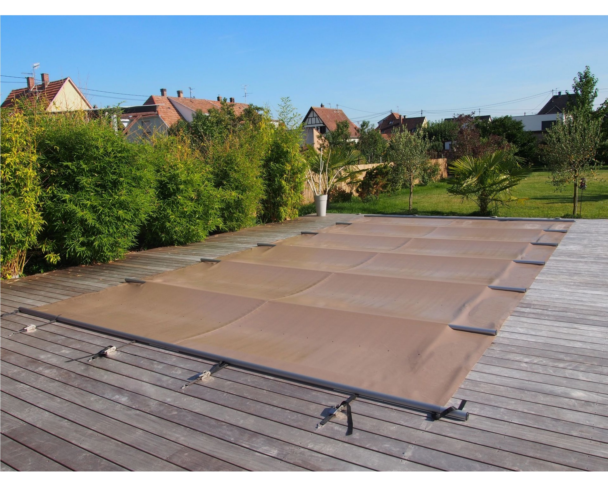 Unsere kindersichere Poolabdeckung. Einiteilig, einfach zu bedienen und trotzdem absolut tragfähig und einsturzsicher.