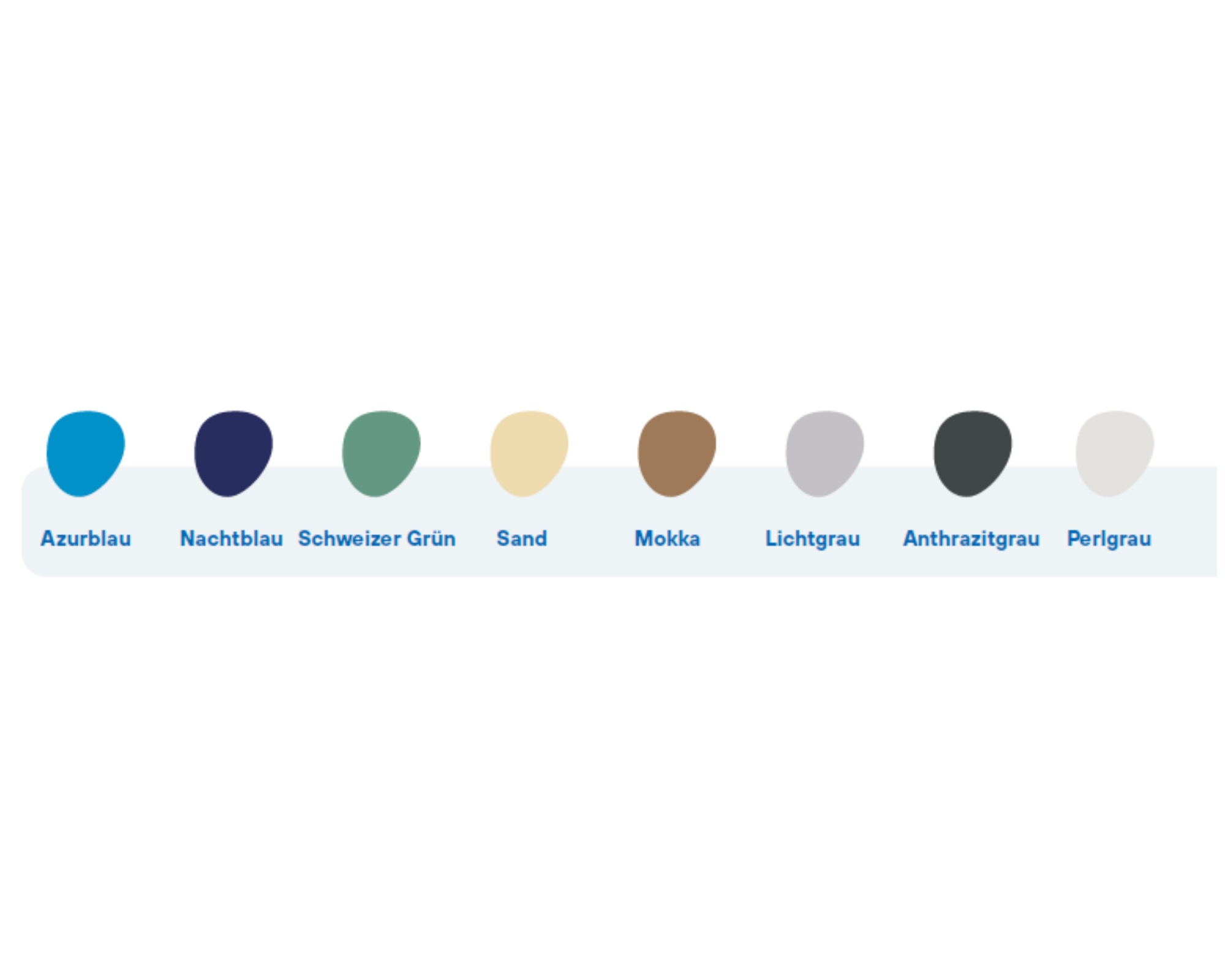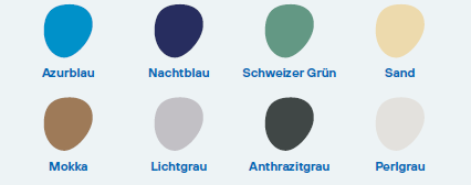 - Diverse Farben: Azurblau, Nachtblau, Schweizer Grün, Sand, Mokka, Lichtgrau, Anthrazitgrau, Perlgrau