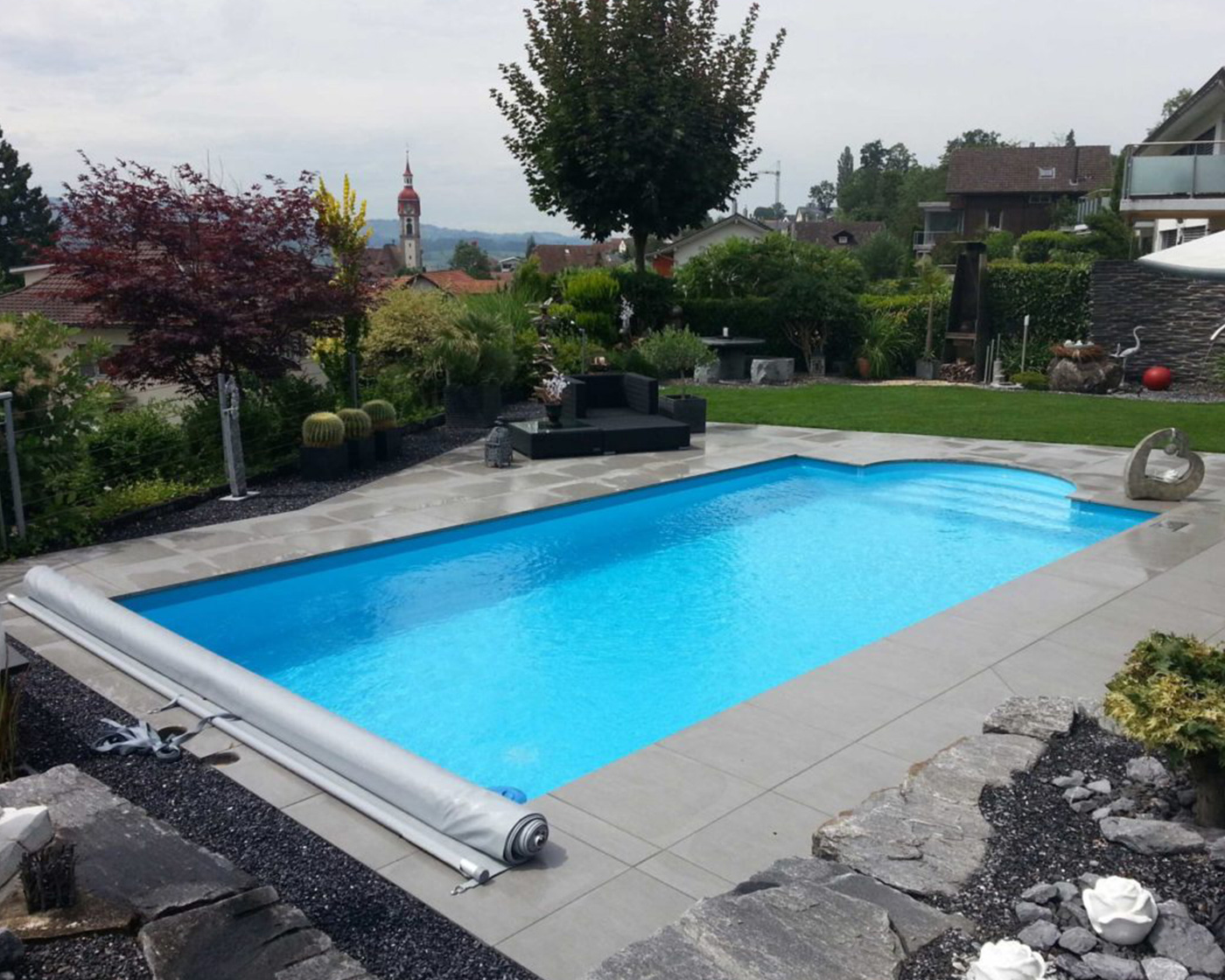 Die INITIAL Rollschutzabdeckung eignet sich hervorragend für die unkomplizierte Nachrüstung bereits bestehender Schwimmbecken. Die Montage erfolgt direkt aufliegend auf dem Poolrandstein. Zur sicheren Fixierung kommen versenkbare Senkstifte zum Einsatz, die bei Nichtgebrauch bündig im Boden verschwinden – so entstehen keine Stolperfallen und die Optik Ihres Gartenbereichs bleibt elegant und sauber.